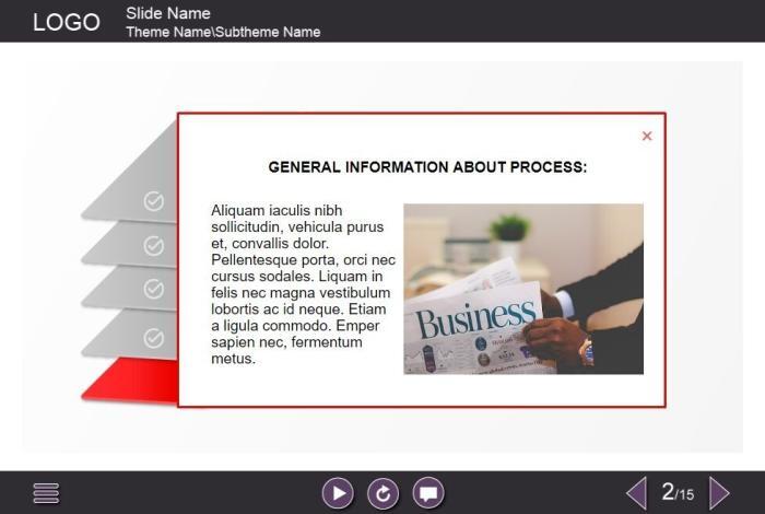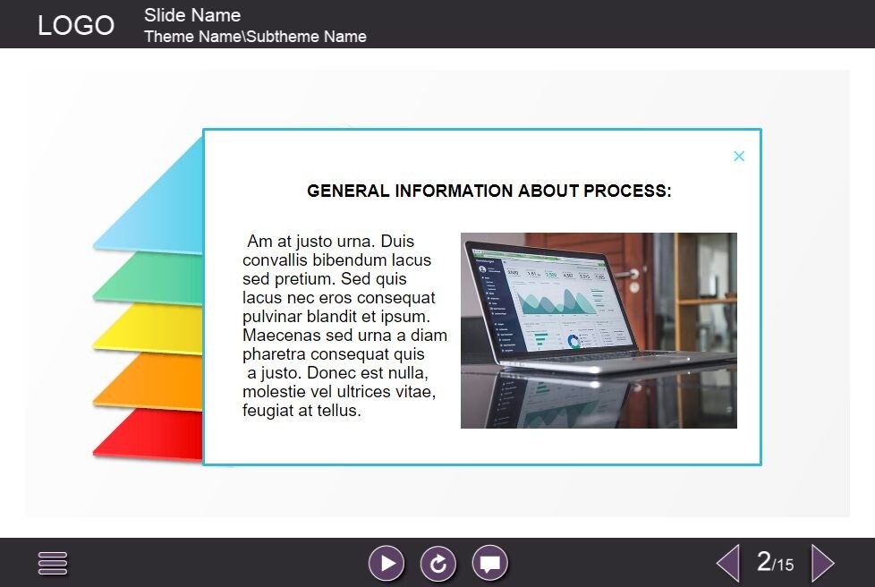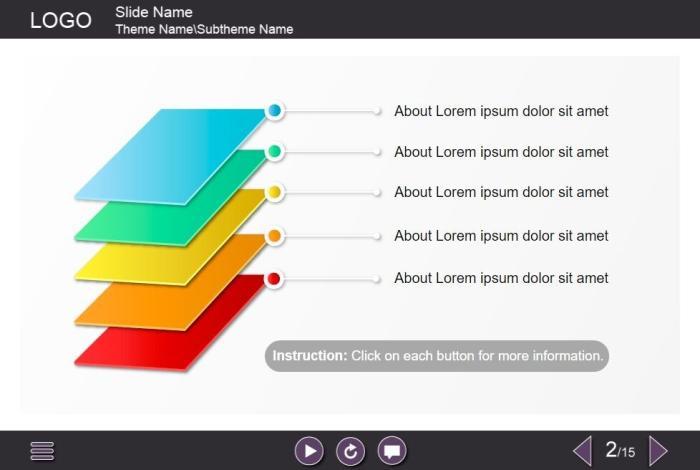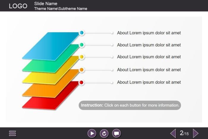 Colorful Layers — Lectora Template. The well-designed interaction slide is composed of five colorful layers located on the left part of the screen. The user must click on each layer to reveal the additional materials in a pop-up window. The template is a ready-made product – all you need to do is to insert the slide into your project and to add own learning materials to it. It is developed with Lectora Publisher 16 authoring tool. Launches well on both PCs and tablets.