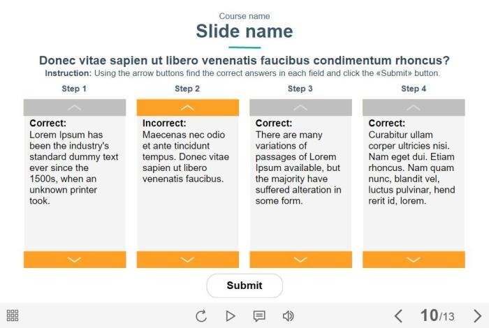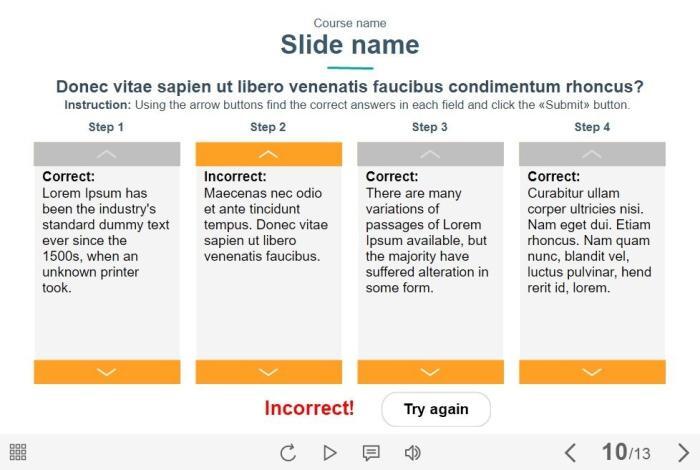 Slideshow Blocks Quiz — Lectora Template. The well-designed interaction slide is composed of four questions represented on the one slide. The user must choose the correct answers by clicking on the up and down arrows, and then check himself with the Submit button. It is possible to retry in case of an unsuccessful attempt. The template is a ready-made product: all you need to do is to insert the slide into your project and to add own learning materials to it. It is fully compatible with the recent Lectora Publisher / Inspire versions. Launches well on both PCs and tablets.