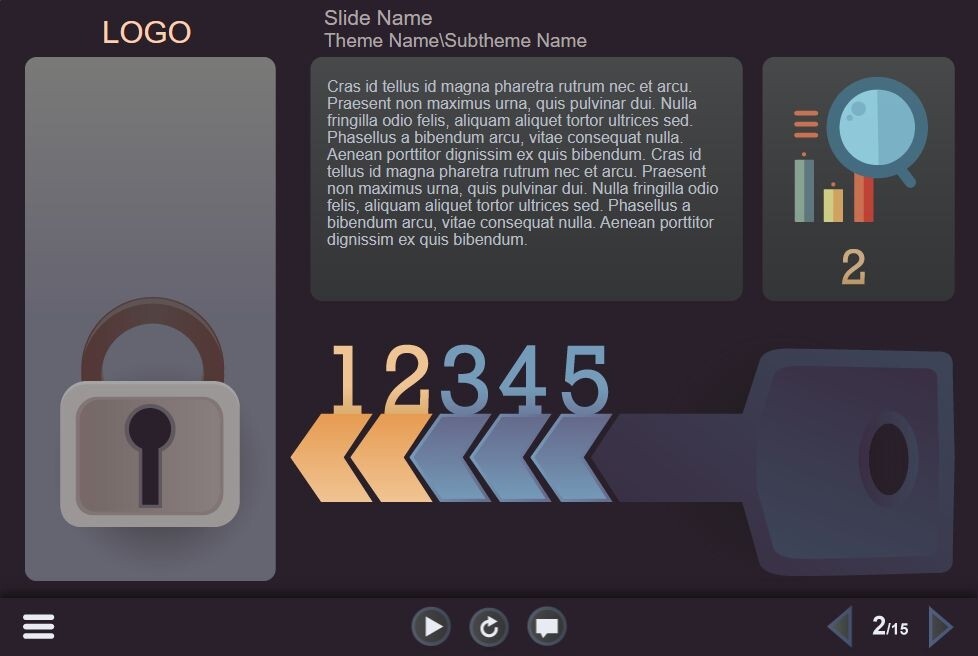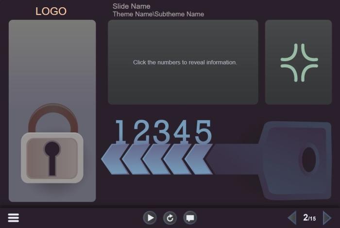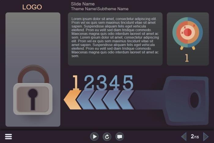 Padlock — Lectora Template. The template is designed with Lectora Publisher 16 tool and is fully compatible with the most recent versions. The slide is composed of 5 clickable buttons designed in the form of a key. The user must click on each button to reveal the additional information. This Lectora interaction would be a great choice to create amazing eLearning courses. All you need is to insert the slide into your project and to fill it with own training content. We’ve collected hundreds of Trivantis Lectora templates which would become great helpers for eCourse developers.