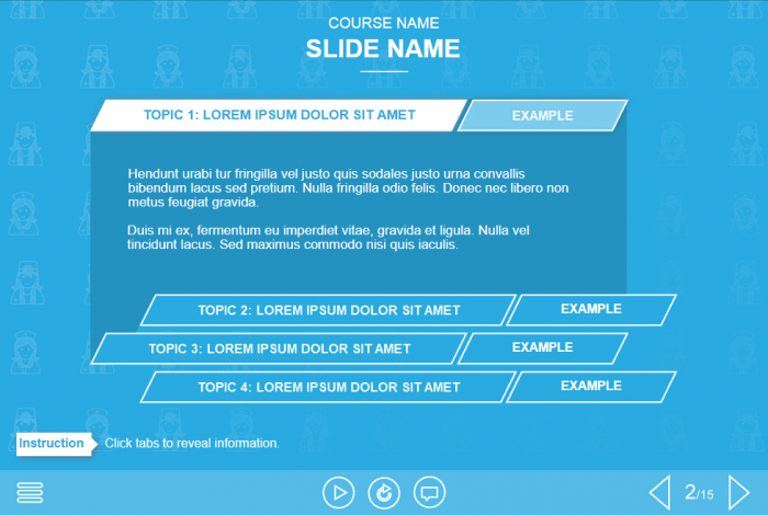 Blue Vertical Accordion — Lectora Template. The unique eLearning template is designed with Lectora Publisher 16 authoring tool. It is composed of 4 main tabs to display the theoretical information, and each main tab contains an additional tab with the example course materials. This template would be an excellent choice to create a powerful training course. It includes cutout photos of a handsome female medician.
