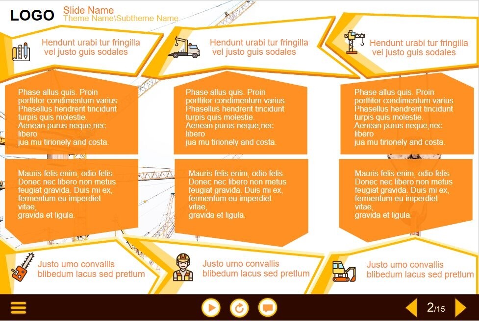 Construction Tabs — Lectora Template. The unique eLearning template is designed with Lectora Publisher 16 authoring tool. The slide contains 6 tabs which are designed to reveal the learning materials. The interaction would be an excellent choice to represent the course information in a creative way. It is fully compatible with the most recent versions of Lectora Publisher / Inspire software. All you need is just to insert the template into your training project and fill it with own eLearning content. Try to use our fascinating templates to create better courses.