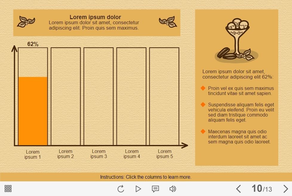 Interactive Column Chart — Lectora Template. The interactive slide contains a simple 5-column chart. The user must click on the columns to reveal the learning materials. This template would be a great addtiion to any kind of web-design project (e-Learning course, advertisement, marketing, etc.).