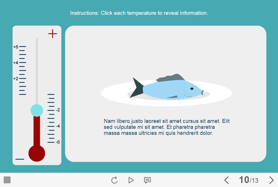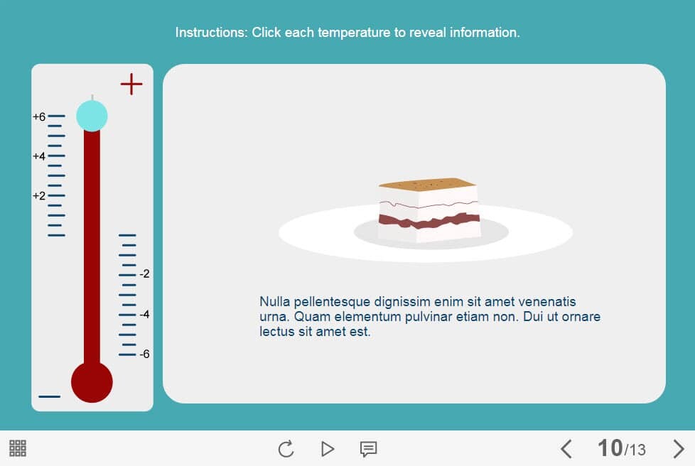 Food Storage — Lectora Template. The interactive slide contains a vertical timeline with 6 buttons designed as temperature values. The user must click on each tempterature to reveal the learning materials about storage conditions for different foods. This template would be a great addtiion to any kind of web-design project (e-Learning course, advertisement, marketing, etc.).