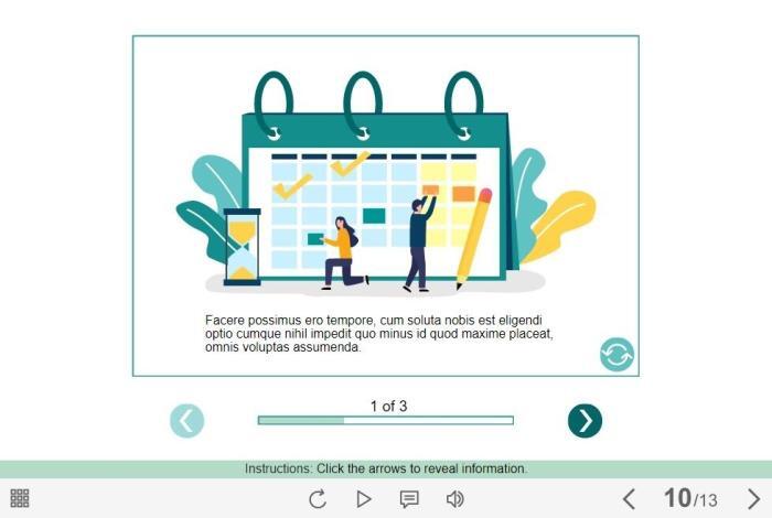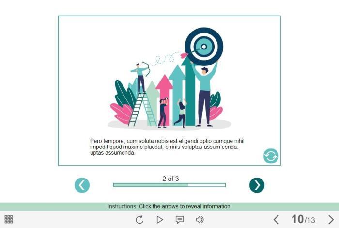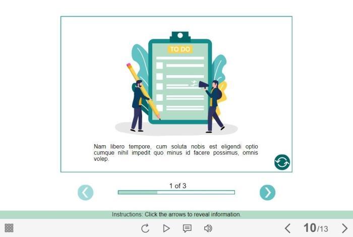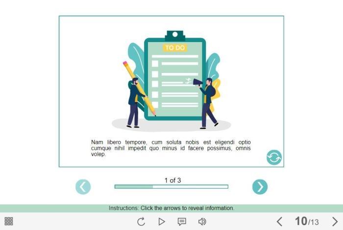 Flip Cards Slideshow — Lectora Template. The eLearning interaction would become a great addition for your eCourse. The slideshow is composed of 3 slides, each of them contains a flip card. The user must click on the left and right arrows to switch between the slides, and a button with coup icon to view all learning materials on each slide. The template is developed with Lectora Publisher 16 authoring tool. It is compatible with the most recent Trivantis Lectora versions. All you need is just to paste the template into your project and to fill it with own learning materials. Try to create better courses with our amazing templates!