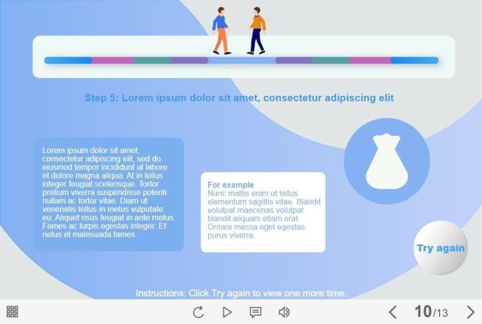 Partnerships Slideshow — Lectora Template. The eLearning interaction slide would become a great addition for your eCourse. It contains a start slide and a basic slideshow that includes 5 layers. The user must click the Start button, and then the Next button to reveal the additional information. It’s possible to review the interaction by clicking the Try Again button. The template is developed with Lectora Publisher 16 authoring tool. It is compatible with the most recent Lectora Inspire versions. All you need is just to paste the template into your project and to fill it with own learning materials. Try to create better courses with our amazing Trivantis Lectora templates!