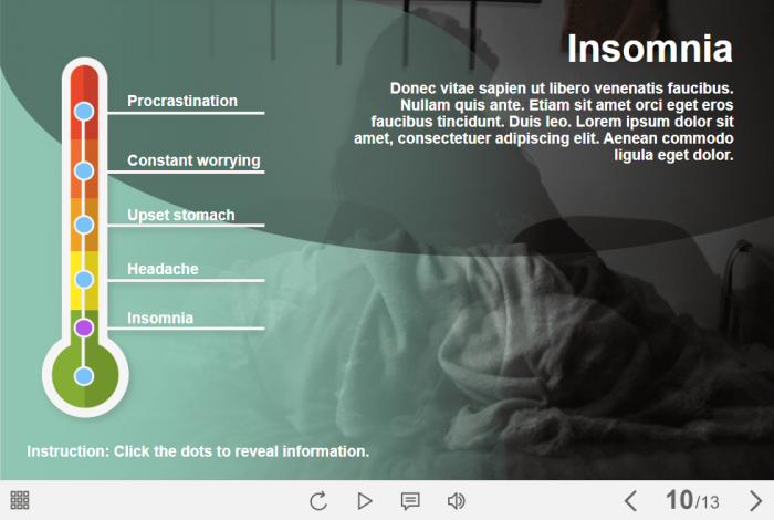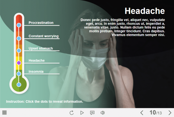 Stress Symptoms Timeline — Lectora Template. The eLearning interaction slide would become a great addition for your eCourse. It contains 6 clickable objects on a vertical timeline that is designed as thermometer. The user must click on each round button to reveal the additional information. The template is developed with Trivantis Lectora 18 tool. All you need is just to paste the template into your project and to fill it with own learning materials. Try to create better courses with our amazing templates!