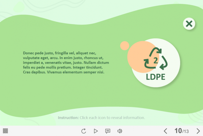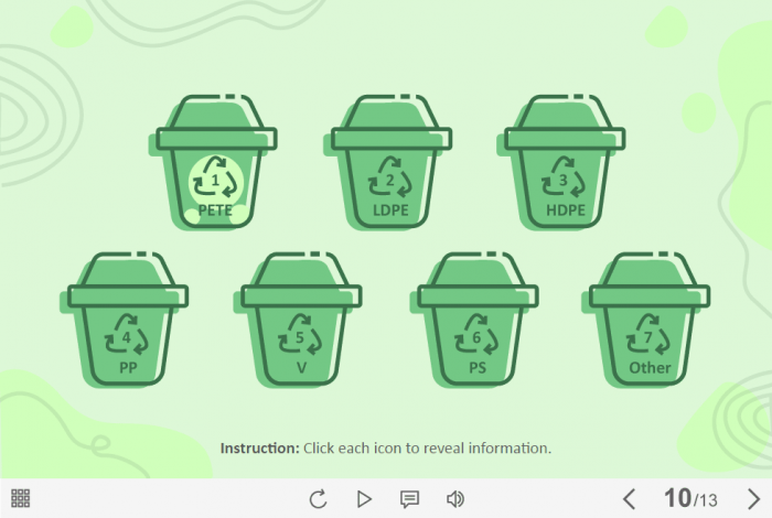 Plastic Recycling — Lectora Template. The eLearning interaction slide would become a great addition for your eCourse. It contains 7 clickable objects designed as trash cans with various icons. The user must click on each of them to reveal the additional information in pop-ups. The template is developed with Trivantis Lectora 18 tool. All you need is just to paste the template into your project and to fill it with own learning materials. Try to create better courses with our amazing templates!