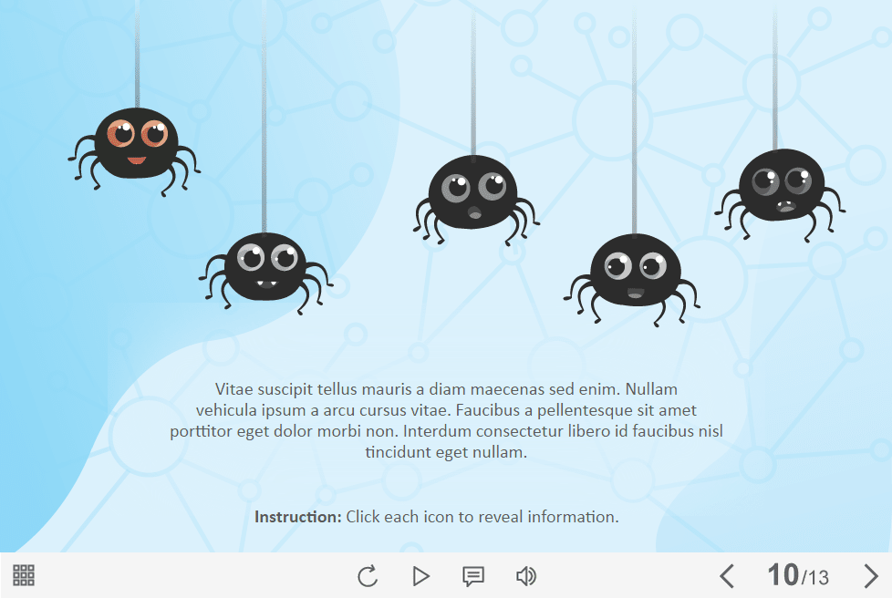 Clickable Cartoon Spiders — Lectora Template. The eLearning interaction slide would become a great addition for your eCourse. It contains 5 clickable objects designed as spiders. The user must click on each of them to reveal the additional information. The template is developed with Trivantis Lectora 18 tool. All you need is just to paste the template into your project and to fill it with own learning materials. Try to create better courses with our amazing templates!
