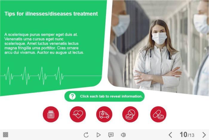 Illness Treatments — Lectora Template. The eLearning interaction slide would become a great addition for your eCourse. It contains 5 clickable round buttons with icons. The user must click on each of them to reveal the additional information. The template is compatible with Lectora 18 and higher version. All you need is just to paste the template into your project and to fill it with own learning materials. Try to create better courses with our amazing Trivantis Lectora templates!