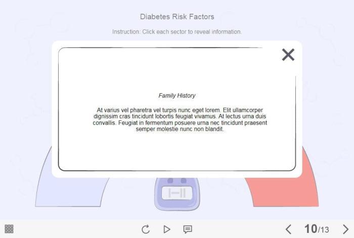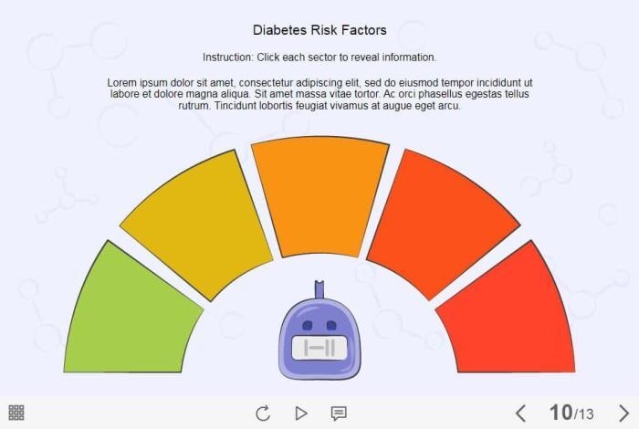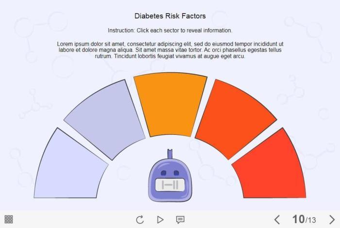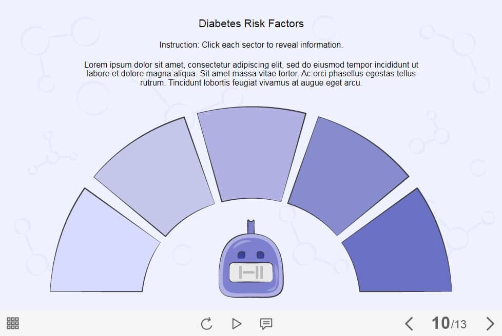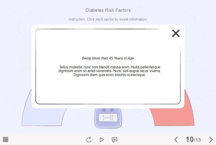 Diabetes Risks Factors — Lectora Template. The eLearning interaction slide would become a great addition for your eCourse. It contains five five clickable objects designed as colorful sectors. The user must click on each of them to reveal the additional information in pop-up messages. The template is compatible with Lectora 18 software. All you need is just to paste the template into your project and to fill it with own learning materials. Try to create better courses with our amazing Trivantis Lectora templates!