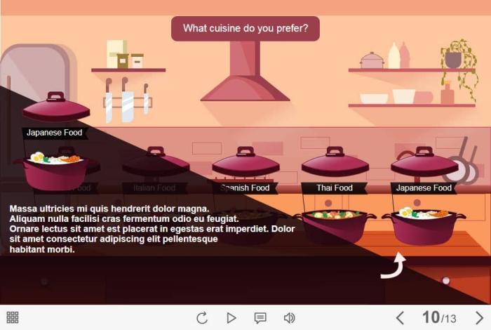 Clickable Pots — Lectora Template. The eLearning interaction slide would become a great addition for your eCourse. It contains five clickable objects designed as pots. The user must click on each of them to reveal the additional information. The template is compatible with Lectora 18 and higher versions. All you need is just to paste the template into your project and to fill it with own learning materials. Try to create better courses with our amazing Trivantis Lectora templates!