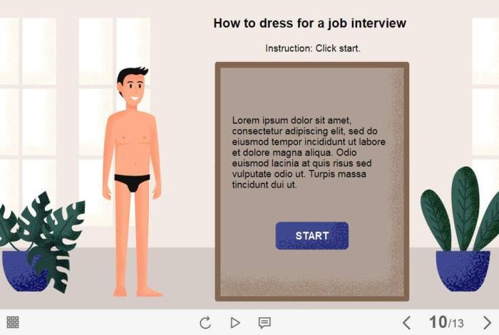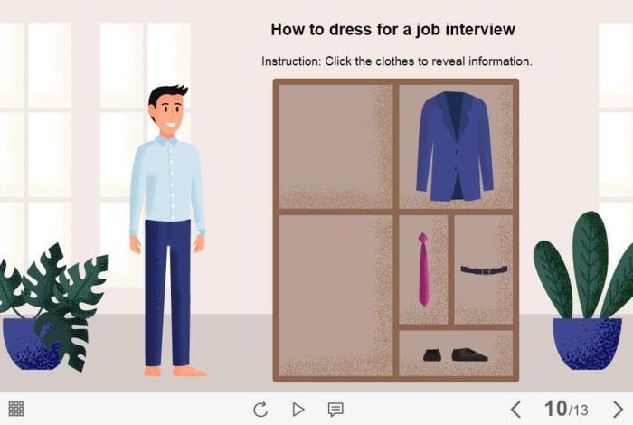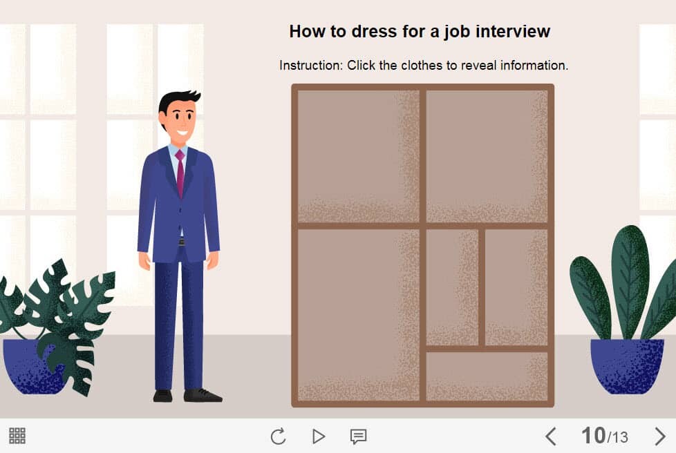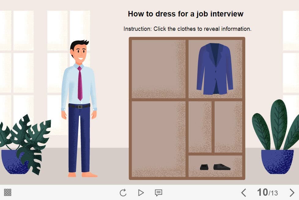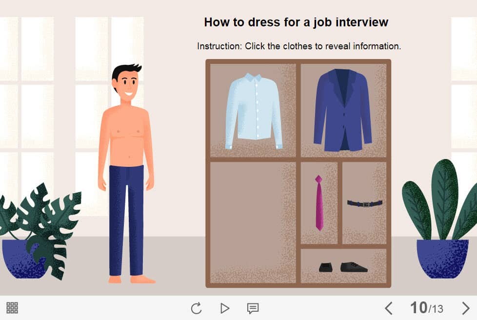 Clickable Clothes — Lectora Template. The eLearning interaction slide would become a great addition for your eCourse. It contains six clickable objects designed as various clothes. The user must click on each of them to reveal the additional information. The template is compatible with Lectora 18 software. All you need is just to paste the template into your project and to fill it with own learning materials. Try to create better courses with our amazing Trivantis Lectora templates!