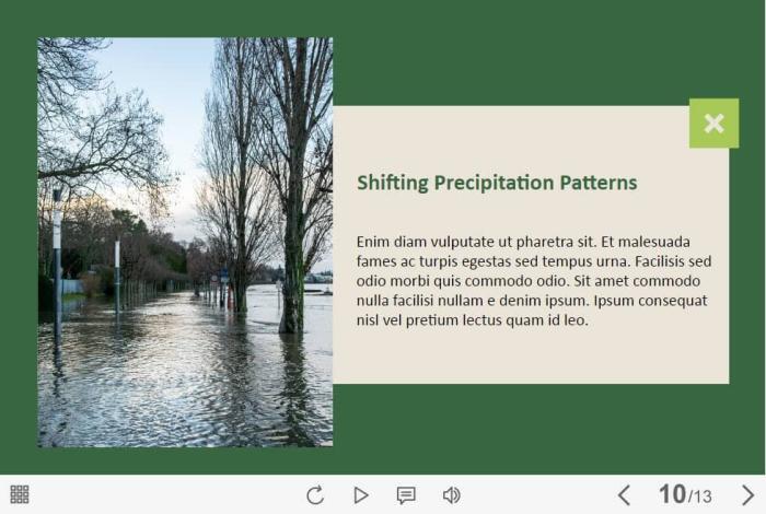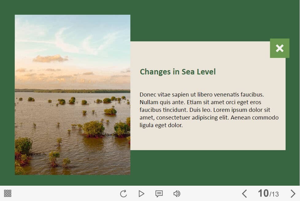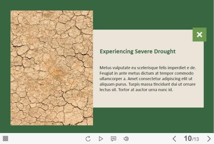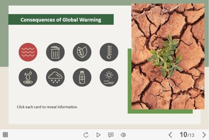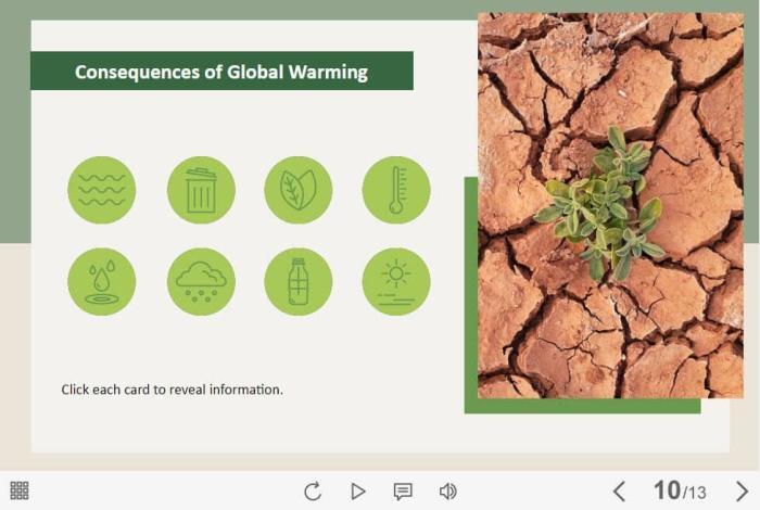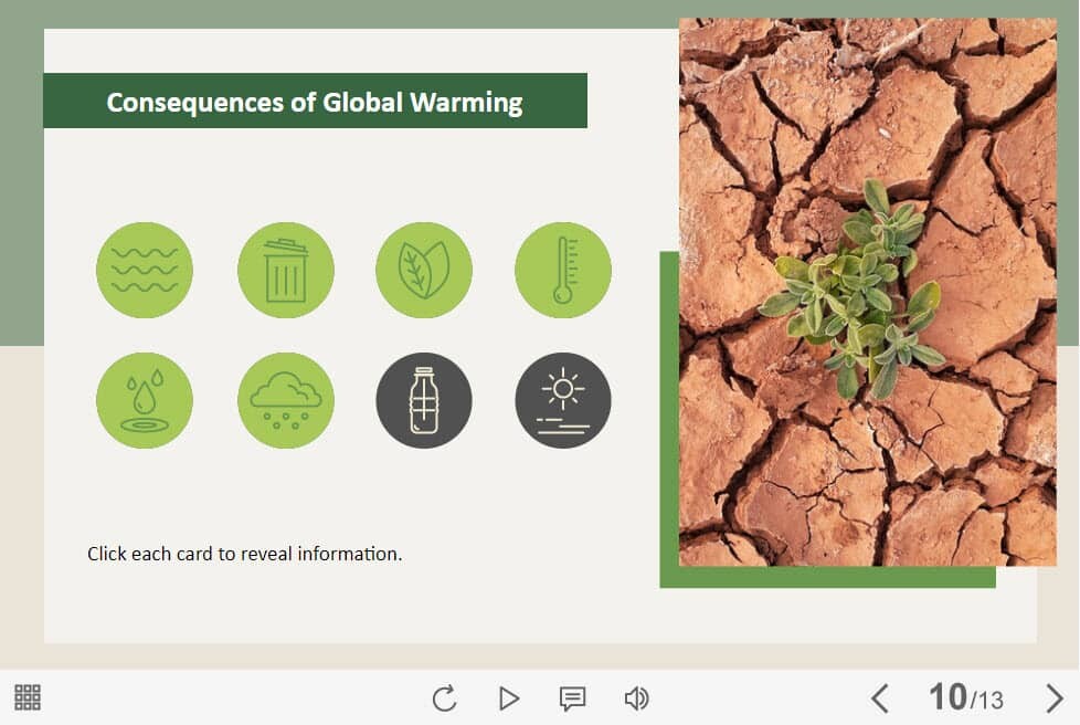 Global Warming Icons — Lectora Template. The eLearning interaction slide would become a great addition for your eCourse. It contains eight clickable icons that are arranged on the left part of the screen. The user must click on each of them to reveal the additional information. The template is compatible with Lectora 18 and higher versions. All you need is just to paste the template into your project and to fill it with own learning materials. Try to create better courses with our amazing Trivantis Lectora templates!