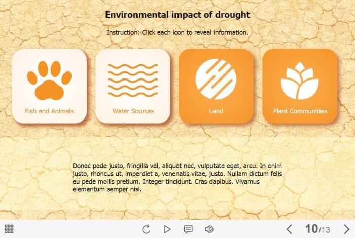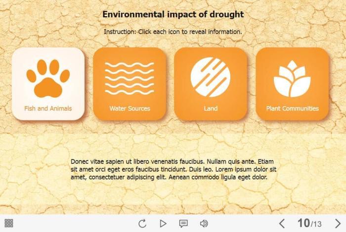Environmental Impact of Drought — Lectora Template. The eLearning interaction slide would become a great addition for your eCourse. It contains four clickable cards with icons. The user must click on each of them to reveal the additional information. The template is compatible with Storyline 3 / 360 software. All you need is just to paste the template into your project and to fill it with own learning materials. Try to create better courses with our amazing Trivantis Lectora templates!