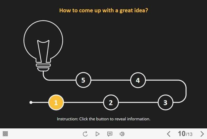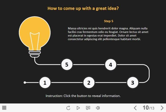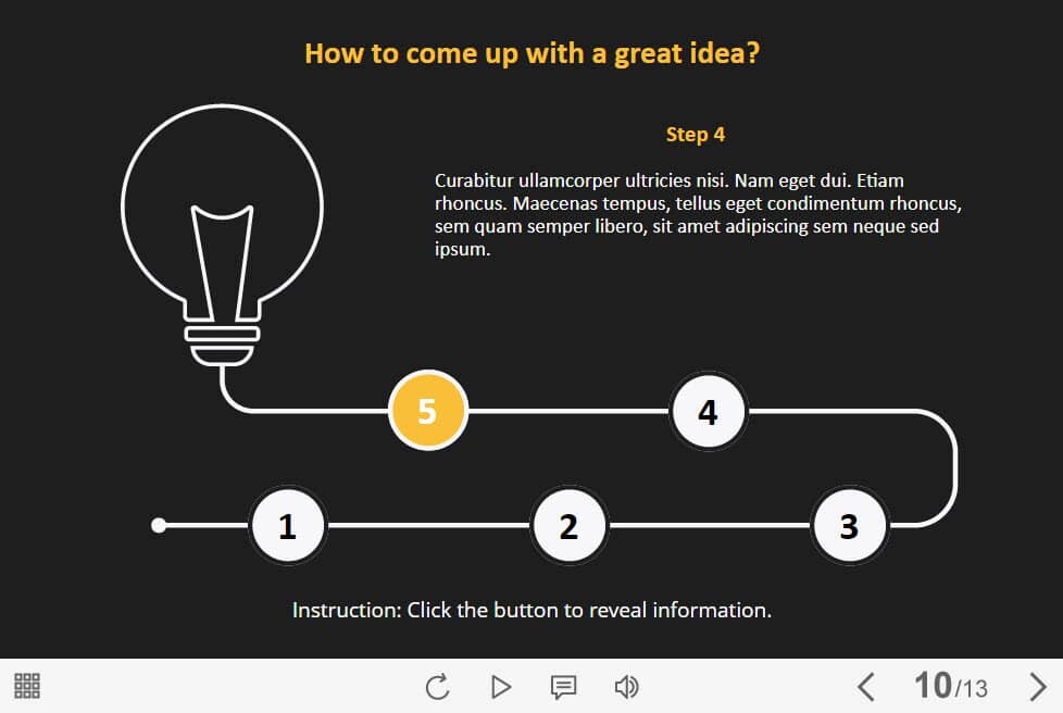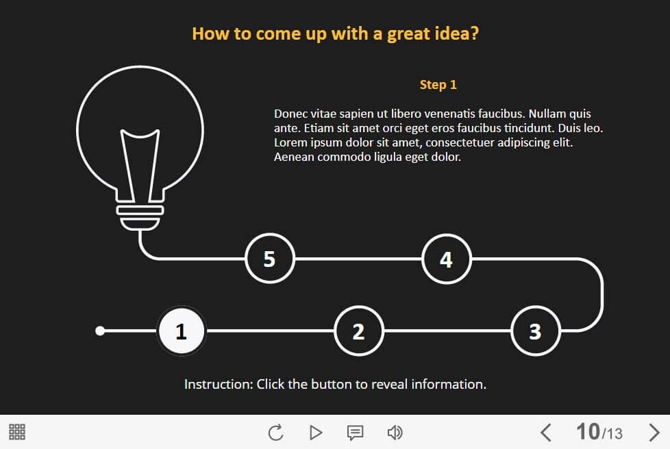 Coming Up with Great Ideas — Lectora Template. The eLearning interaction slide would become a great addition for your eCourse. It contains five buttons designed as numbered circles. The user must click on each of them to reveal the additional information. The template is designed with Lectora 18 software. All you need is just to paste the template into your project and to fill it with own learning materials. Try to create better courses with our amazing Trivantis Lectora templates!