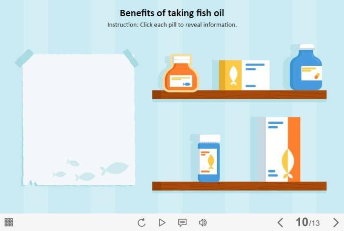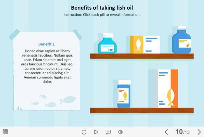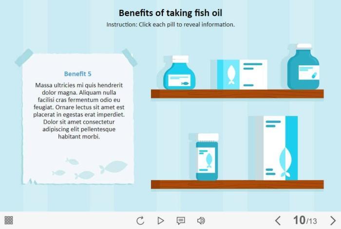 Clickable Pills — Lectora Template. The eLearning interaction slide would become a great addition for your eCourse. It contains five clickable objects designed as pills. The user must click on each of them to reveal the additional information. The template is developed with Lectora 18 software. All you need is just to paste the template into your project and to fill it with own learning materials. Try to create better courses with our amazing Trivantis Lectora templates!