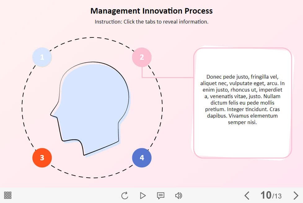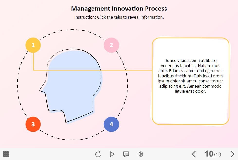 Management Innovation Process — Lectora Template. The eLearning interaction slide would become a great addition for your eCourse. It contains four clickable objects designed as colored circles. The user must click on each of them to reveal the additional information. The template is developed with Lectora 18 software. All you need is just to paste the template into your project and to fill it with own learning materials. Try to create better courses with our amazing Trivantis Lectora templates!