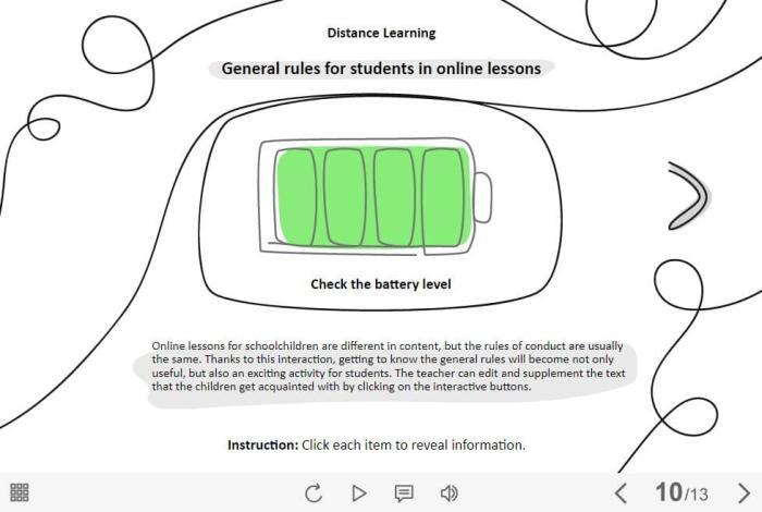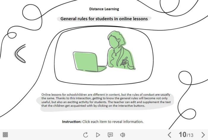 Online Lessons Rules — Lectora Template. The eLearning interaction slide would become a great addition for your eCourse. It is composed of four slides with one clickable object on each slide. The user must click on the right and left arrows to switch between the slides, and click on objects on each slide to reveal the additional information. The template is developed with Lectora 18 software. All you need is just to paste the template into your project and to fill it with own learning materials. Try to create better courses with our amazing Trivantis Lectora templates!