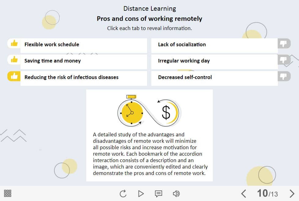 Pros and Cons of Remote Work — Lectora Template. The eLearning interaction slide would become a great addition for your eCourse. It represents an accordion with six tabs divided in two columns. The user must click on each tab to reveal the additional information. The template is compatible with Lectora 18 and higher software. All you need is just to paste the template into your project and to fill it with own learning materials. Try to create better courses with our amazing Trivantis Lectora templates!