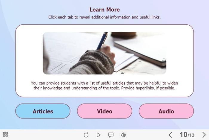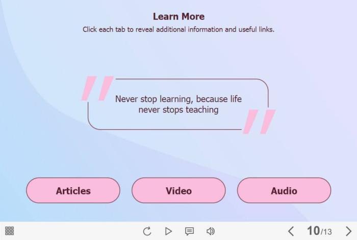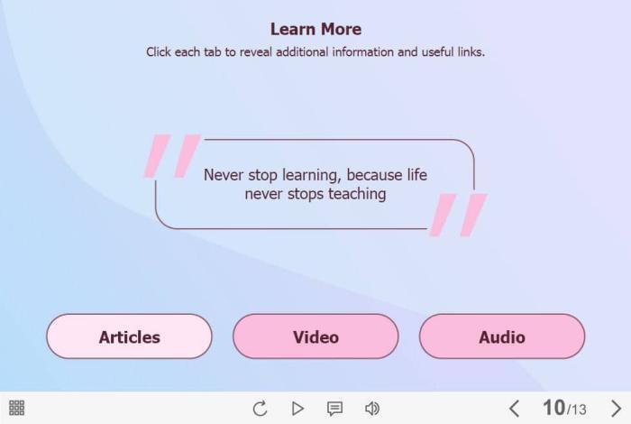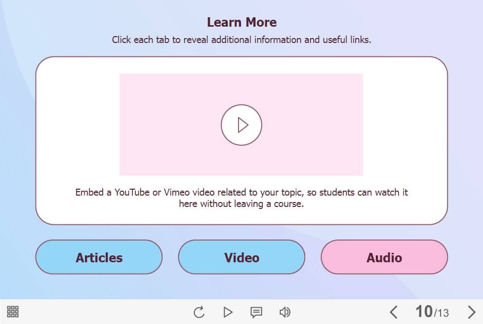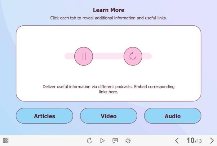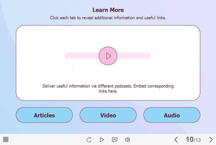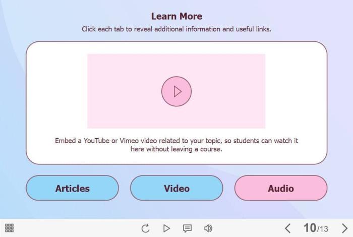 Three Horizontal Tabs — Lectora Template. The eLearning interaction slide would become a great addition for your eCourse. It contains three tabs that are arranged at the bottom part of the screen. The user must click on each of them to reveal the additional information. The template is compatible with Lectora 18 and higher software. All you need is just to paste the template into your project and to fill it with own learning materials. Try to create better courses with our amazing Trivantis Lectora templates!