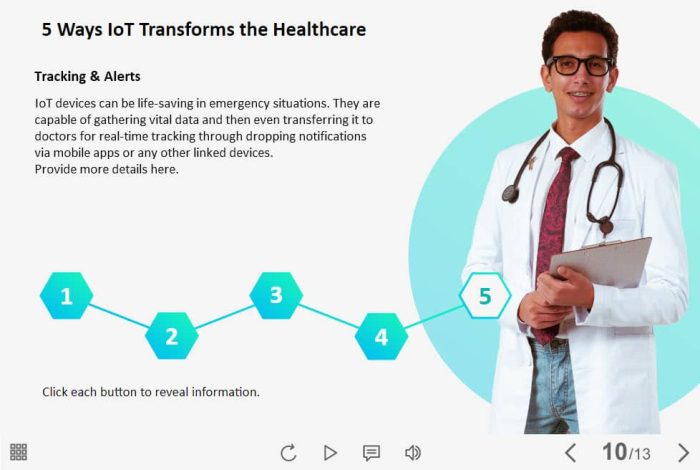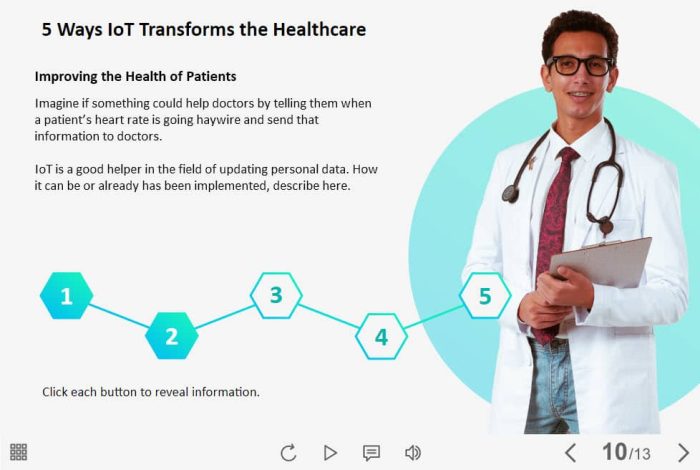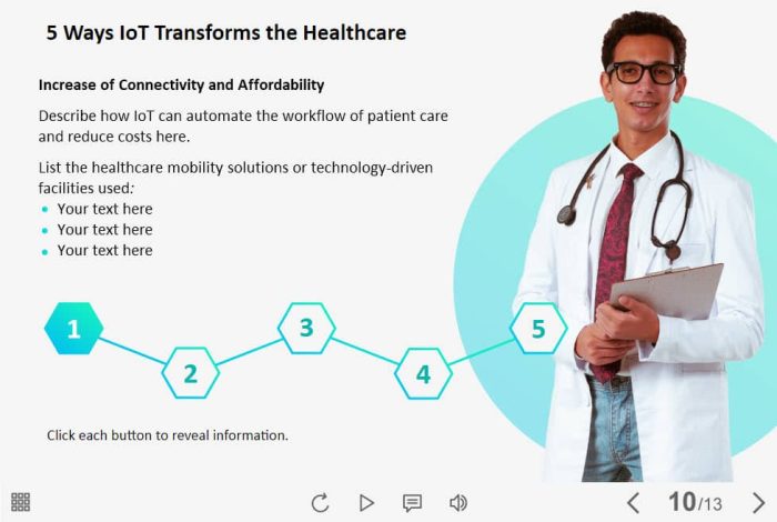 IoT Healthcare Tabs — Lectora Template. The eLearning interaction slide would become a great addition for your eCourse. It contains five clickable tabs with numbers. The user must click on each of them to reveal the additional information. The template is compatible with Lectora 18 and higher versions. All you need is just to paste the template into your project and to fill it with own learning materials. Try to create better courses with our amazing Trivantis Lectora templates!