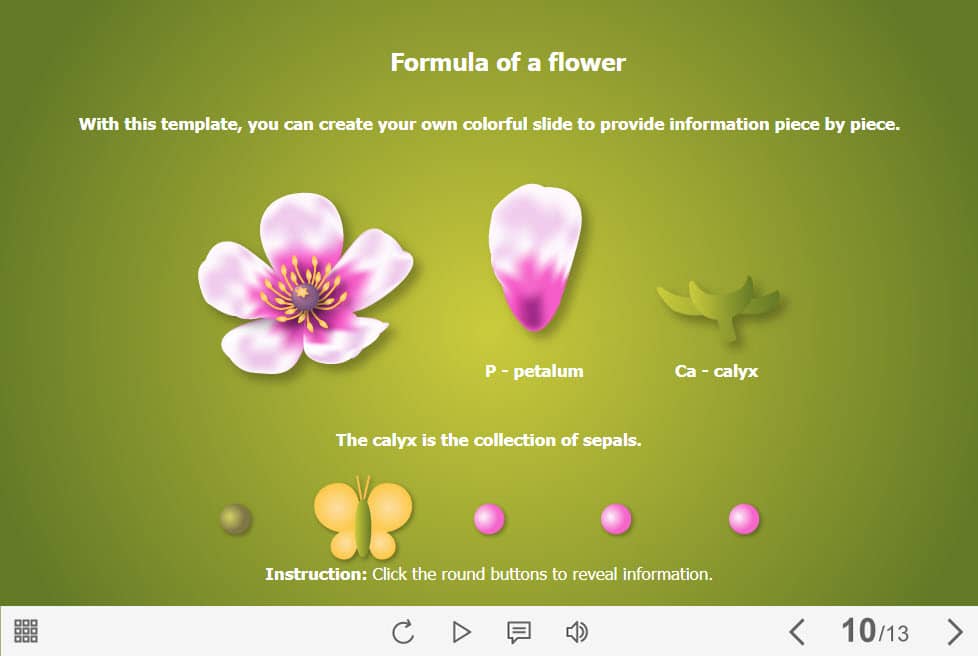 Flower Formula — Lectora Template. The eLearning interaction slide would become a great addition for your eCourse. It contains five round buttons arranged under the flower image. The user must click on each of them to reveal the additional information. The template is compatible with Lectora 18 and higher versions. All you need is just to paste the template into your project and to fill it with own learning materials. Try to create better courses with our amazing Trivantis Lectora templates!
