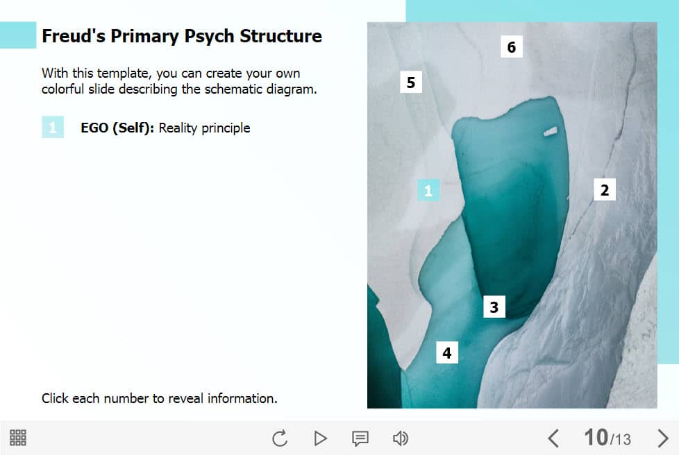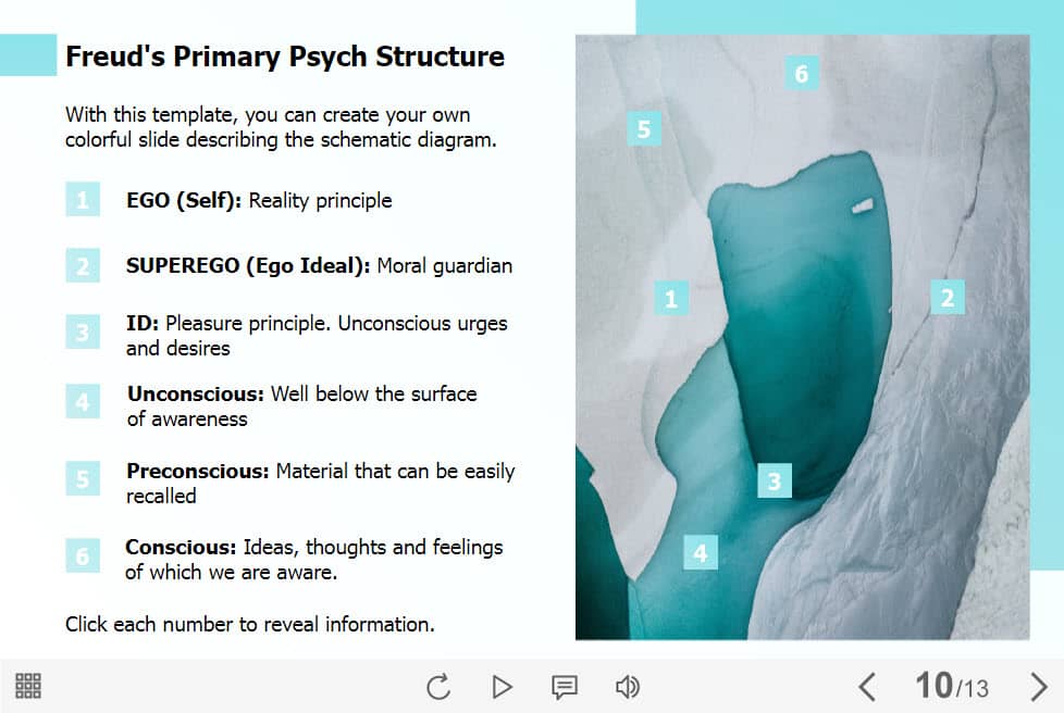 Primary Psych Structure — Lectora Template. The eLearning interaction slide would become a great addition for your eCourse. It contains six clickable markers arranged at the right part of the screen. The user must click on each of them to reveal the additional information. The template is compatible with Lectora 18 software. All you need is just to paste the template into your project and to fill it with own learning materials. Try to create better courses with our amazing Trivantis Lectora templates!