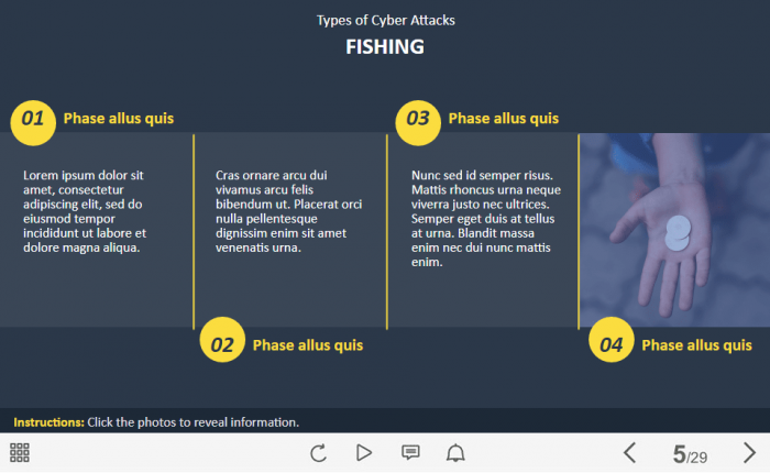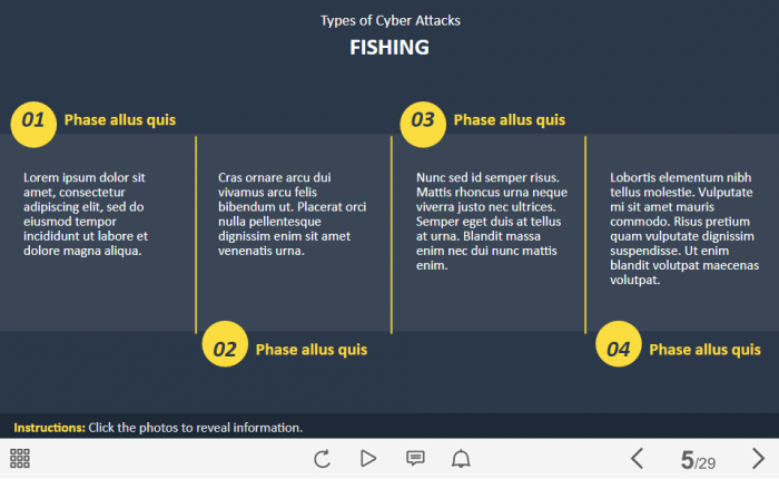 Fishing Types — Lectora Template. The unique eLearning interaction is designed with Lectora 18 software. The template contains four images related to fishing theme. The user must click on them to reveal the additional materials. The template slide is a ready-made product: all you need is to insert it into the projects and fill with own training content. We recommend to launch it on the devices with the screen size more than 7 inches. We’ve collected lots of Trivantis Lectora templates to speed up the course development and to save you from routine work.