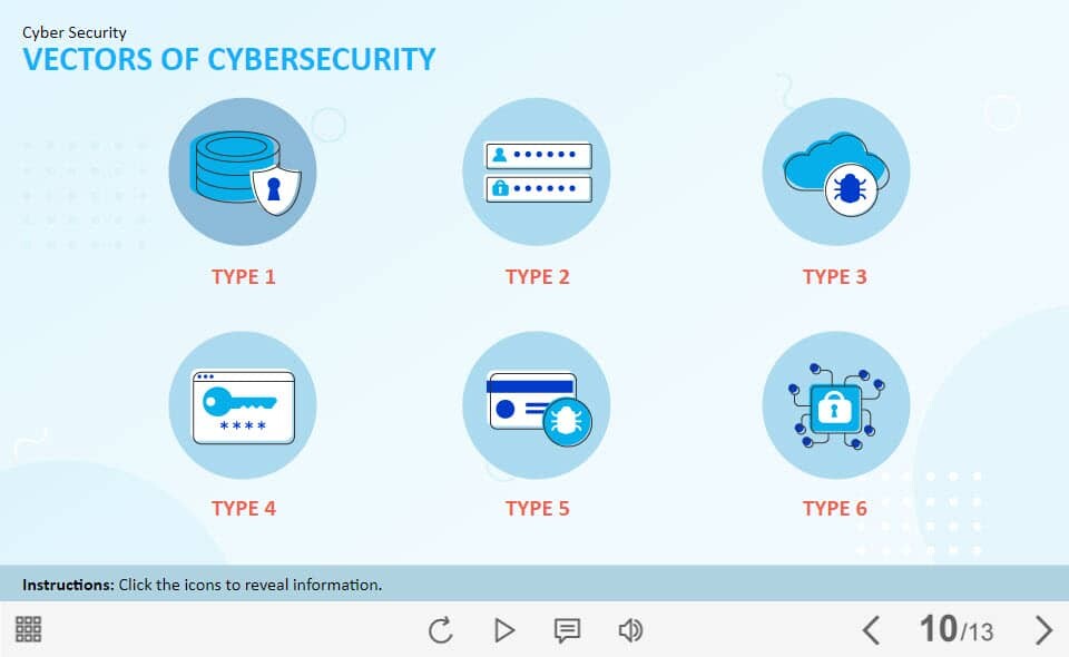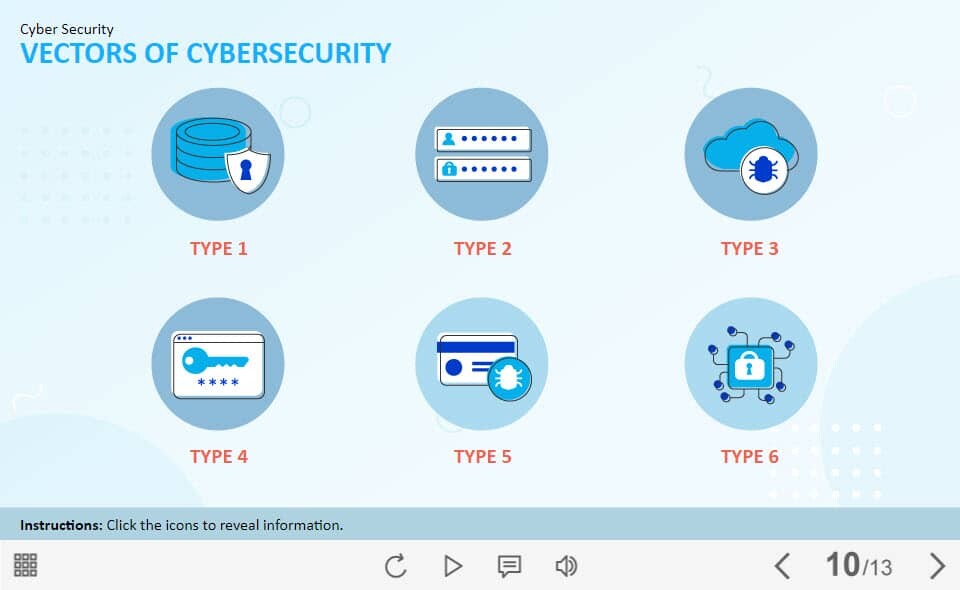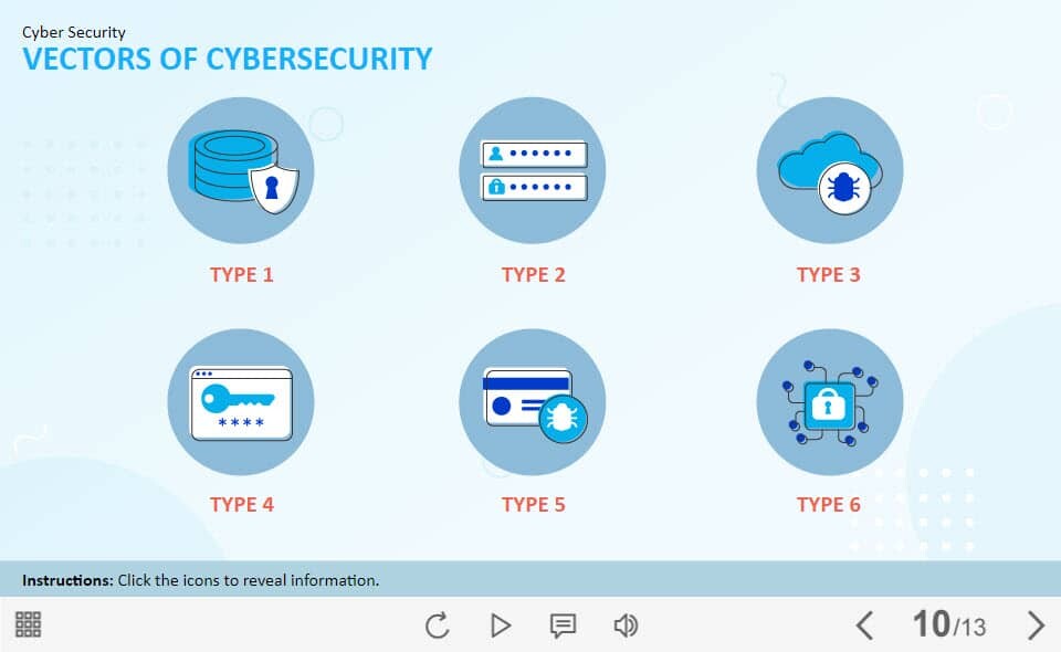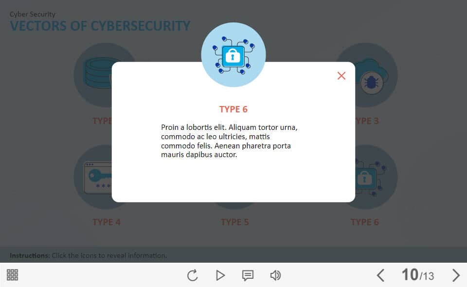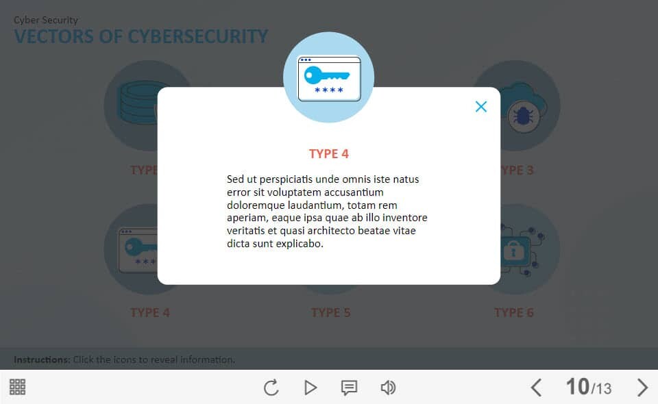 Clickable Icons — Lectora Template. The unique eLearning interaction is designed with Lectora 18. It contains six clickable round icons. The user must click on them to reveal the additional materials. The template slide is a ready-made product: all you need is to insert it into the projects and fill with own training content. We recommend to launch it on the devices with the screen size more than 7 inches. We’ve collected lots of Trivantis Lectora templates to speed up the course development and to save you from routine work.