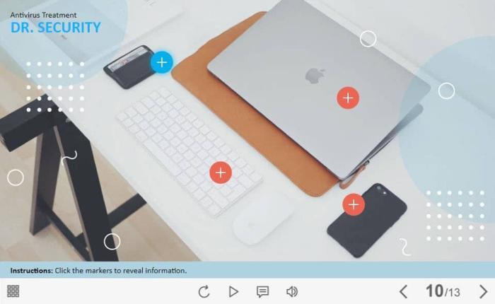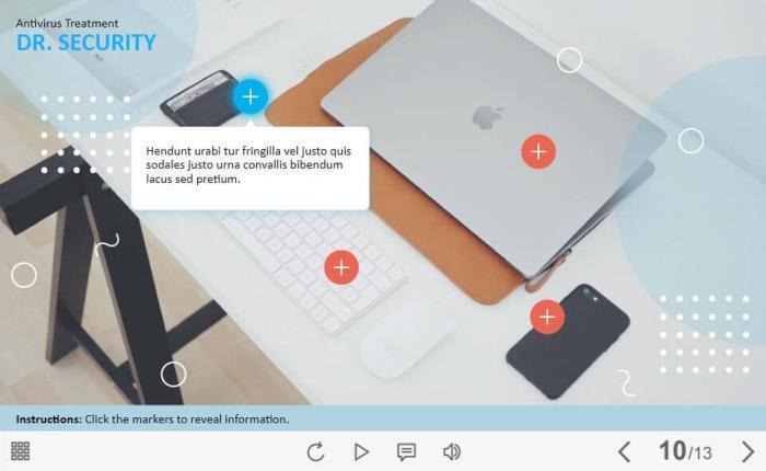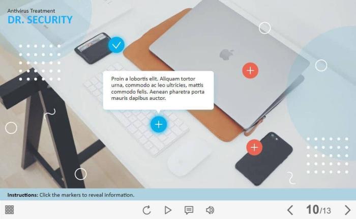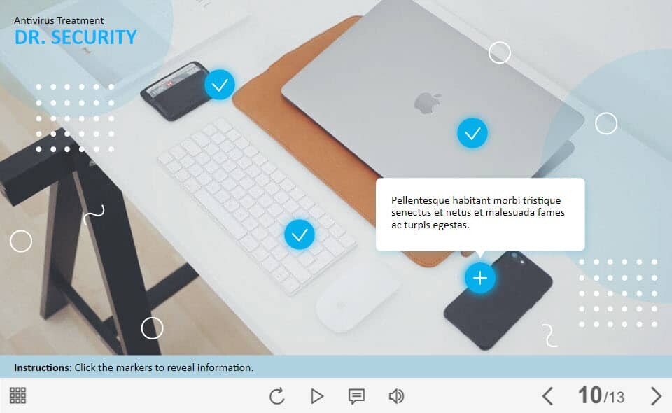 Markers over Image — Lectora Template. The unique eLearning interaction is designed with Trivantis Lectora 18. The template contains four round markers that are placed over the image. The user must click on them to reveal the additional materials in callouts. The template slide is a ready-made product: all you need is to insert it into the projects and fill with own training content. We recommend to launch it on the devices with the screen size more than 7 inches. We’ve collected lots of Trivantis Lectora templates to speed up the course development and to save you from routine work.