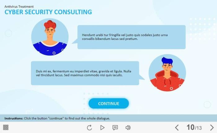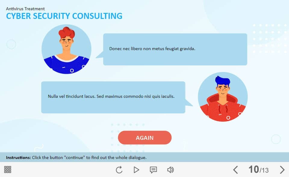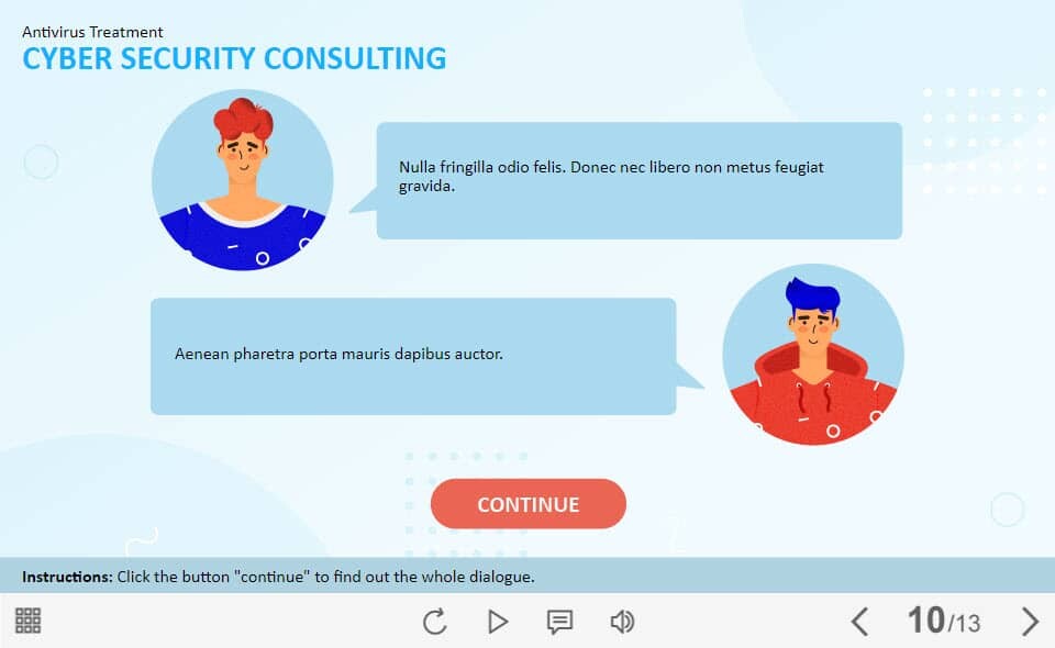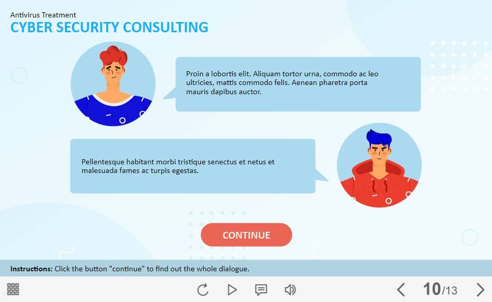 Interactive Dialogue — Lectora Template. The unique eLearning interaction is designed with Lectora 18 software. The template contains illustrations of two characters who are talking to each other. The user must click on the button to reveal the additional part of their conversation. The template slide is a ready-made product: all you need is to insert it into the projects and fill with own training content. We recommend to launch it on the devices with the screen size more than 7 inches. We’ve collected lots of Trivantis Lectora templates to speed up the course development and to save you from routine work.
