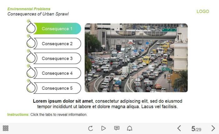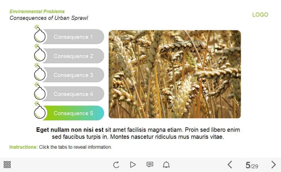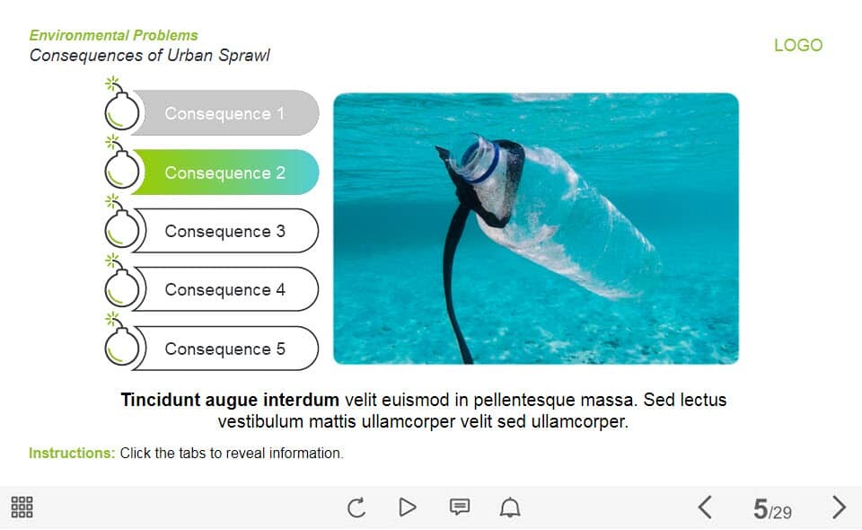Five Vertical Tabs — Lectora Template. The unique eLearning interaction is designed with Lectora 18 software. The template contains 5 tabs placed at the left part of the slide. The user must click each of them to reveal the additional materials. The template slide is a ready-made product: all you need is to insert it into the projects and fill with own training content. It’s recommended to launch it on the devices with the screen size more than 7 inches.