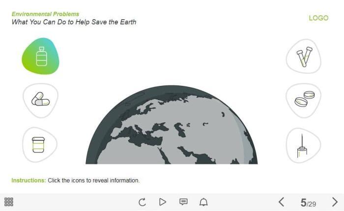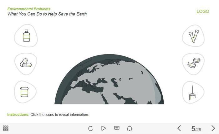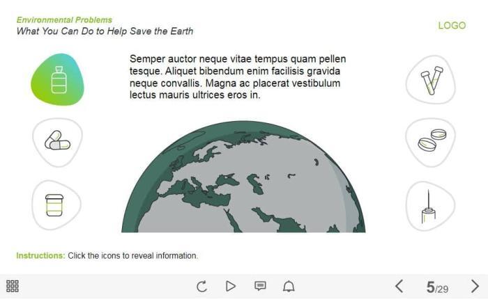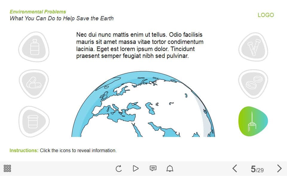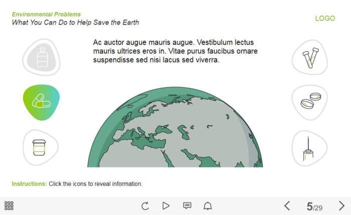Click on the Medicines — Lectora Template. The unique eLearning interaction is designed with Lectora 18 software. The template contains 6 clickable objects placed around the earth image. The user must click on each of them to reveal the additional materials. The template slide is a ready-made product: all you need is to insert it into the projects and fill with own training content. It’s recommended to launch it on the devices with the screen size more than 7 inches.
