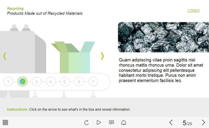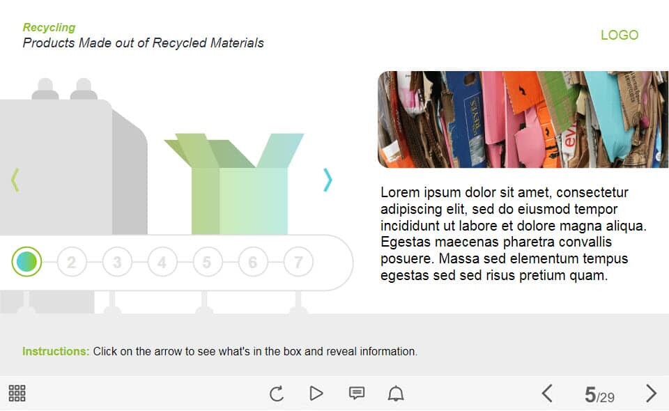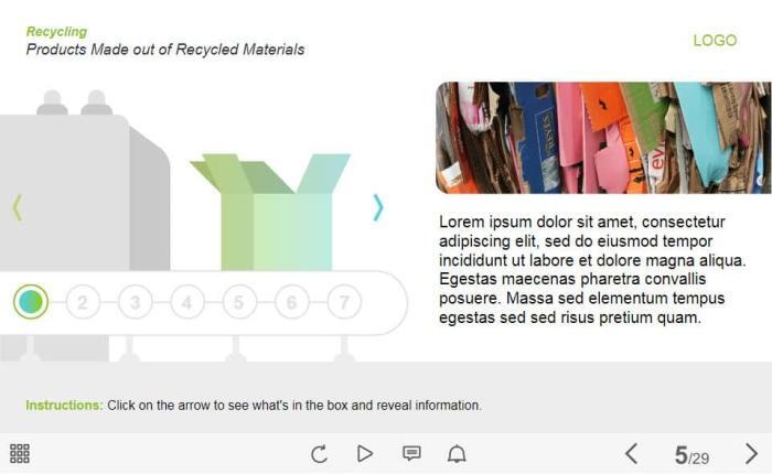Recycle Products Slideshow — Lectora Template. The unique eLearning interaction is designed with Lectora 18 software. The template represents an unique slideshow designed as a conveyor belt. The user must click click the left and right arrows to switch between the states and to reveal the additional materials. The template slide is a ready-made product: all you need is to insert it into the projects and fill with own training content. It’s recommended to launch it on the devices with the screen size more than 7 inches.