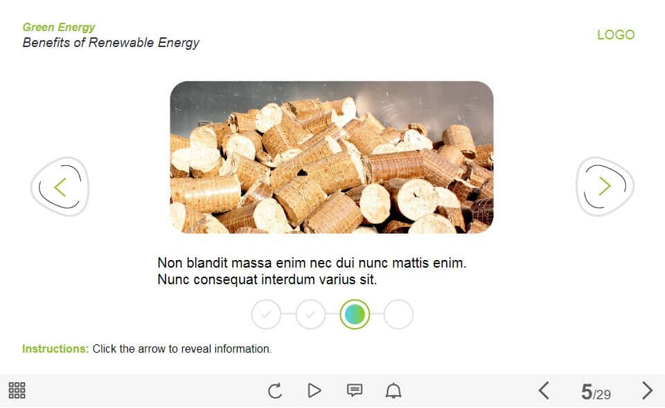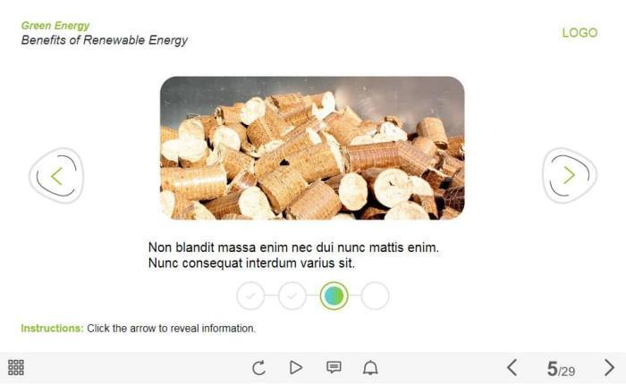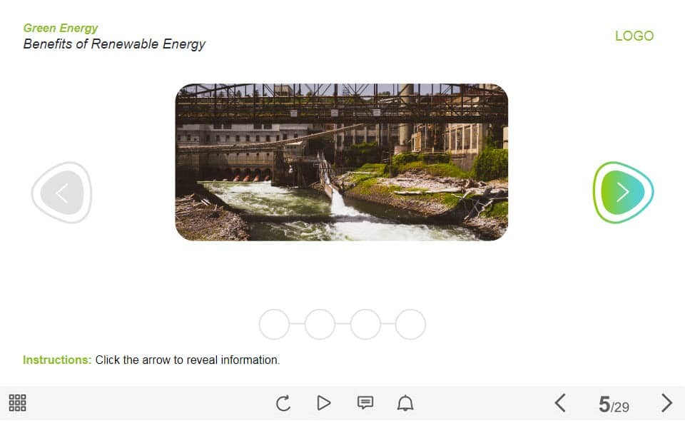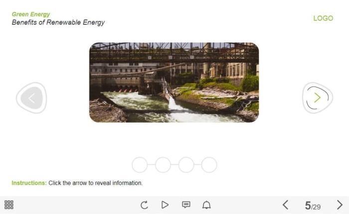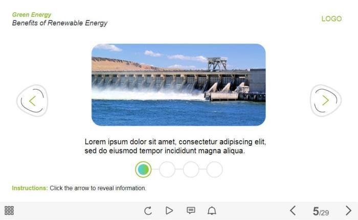 Renewable Energy Slideshow — Lectora Template. The unique eLearning interaction is designed with Lectora 18. The template represents a classic slideshow that is composed of 5 slides. The user must click the left and right arrows to switch between the slides and to reveal the additional materials. The template slide is a ready-made product: all you need is to insert it into the projects and fill with own training content. It’s recommended to launch it on the devices with the screen size more than 7 inches.