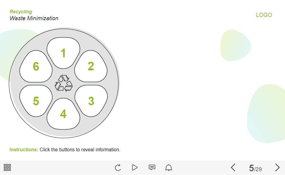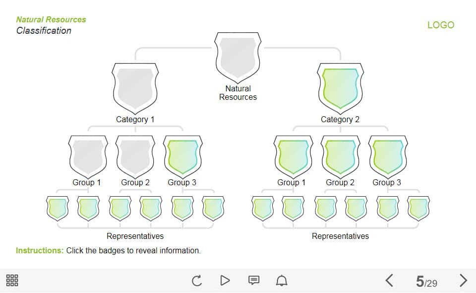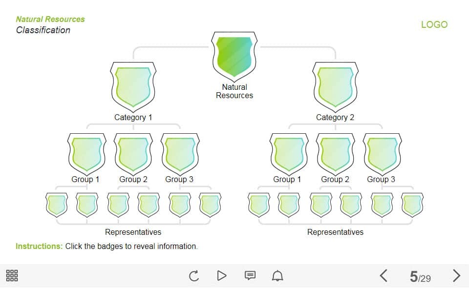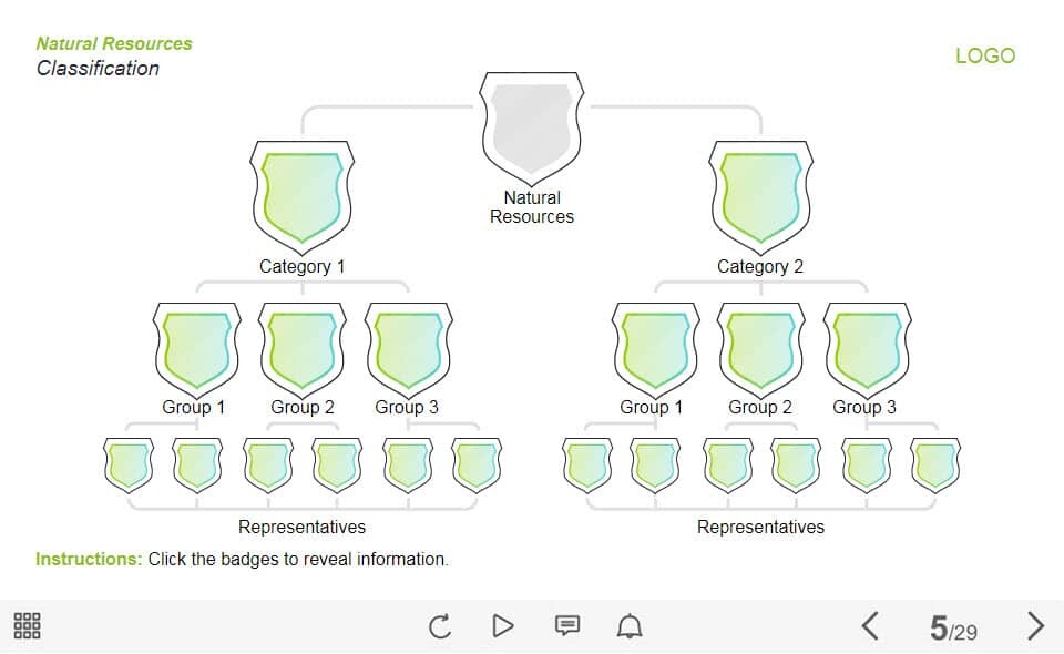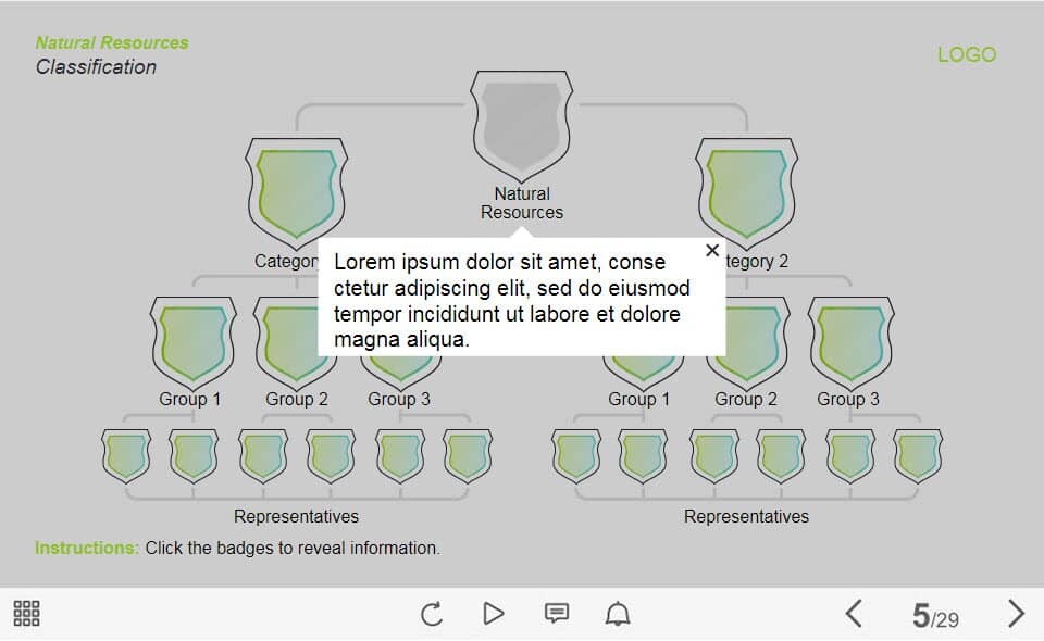 Clickable Badges — Lectora Template. The unique eLearning interaction is designed with Lectora 18. The template contains 21 clickable buttons designed as badges. The user must click each of them to reveal the additional materials in callouts. The template slide is a ready-made product: all you need is to insert it into the projects and fill with own training content. It’s recommended to launch it on the devices with the screen size more than 7 inches.