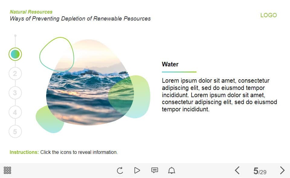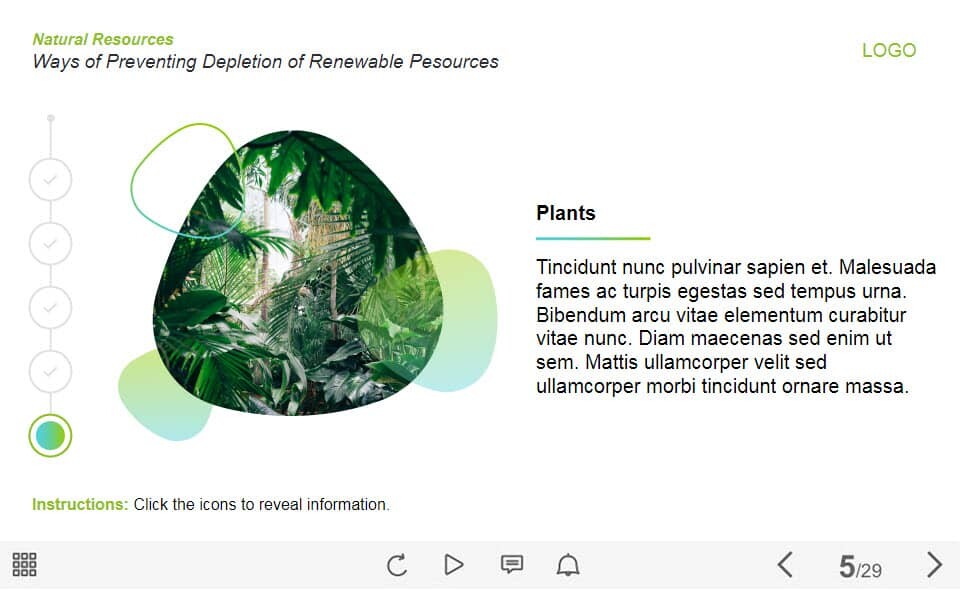 Vertical Timeline — Lectora Template. The unique eLearning interaction is designed with Lectora 18. The template contains a vertical timeline with six buttons. The user must click on each of them to reveal the additional materials. The template slide is a ready-made product: all you need is to insert it into the projects and fill with own training content. It’s recommended to launch it on the devices with the screen size more than 7 inches.