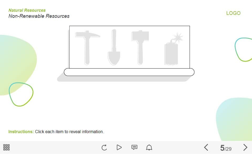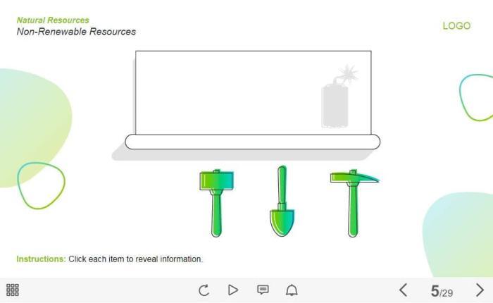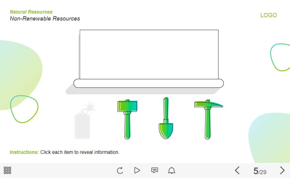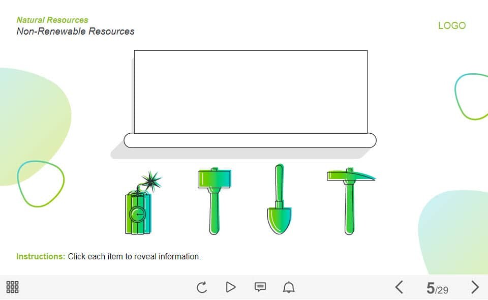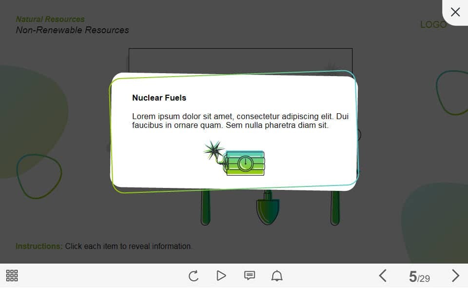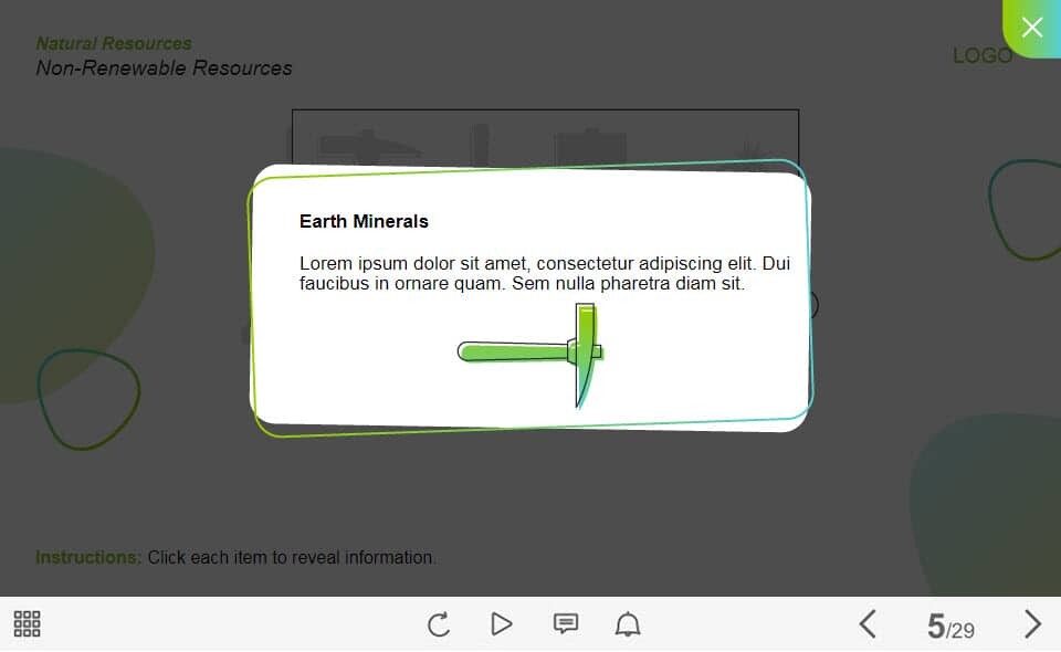 Clickable Mining Tools — Lectora Template. The unique eLearning interaction is designed with Lectora 18. The template contains 4 clickable items. The user must click on each of them to reveal the additional materials in pop-ups. The template slide is a ready-made product: all you need is to insert it into the projects and fill with own training content. It’s recommended to launch it on the devices with the screen size more than 7 inches.