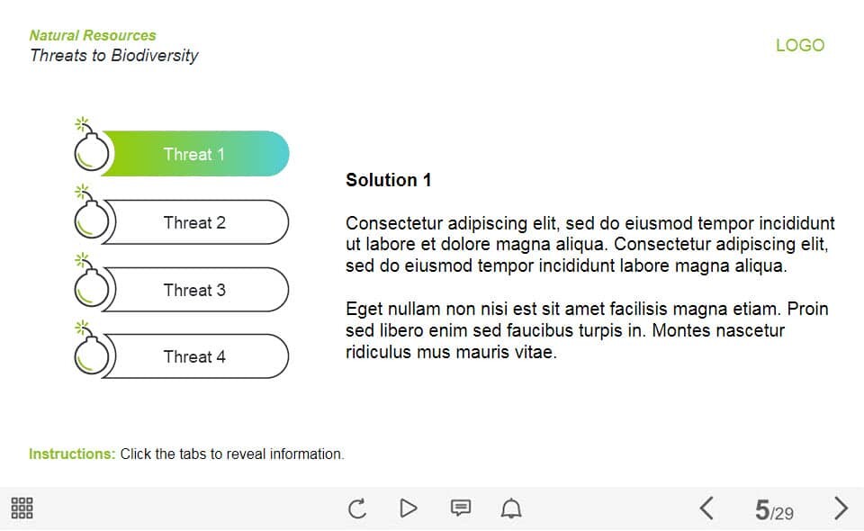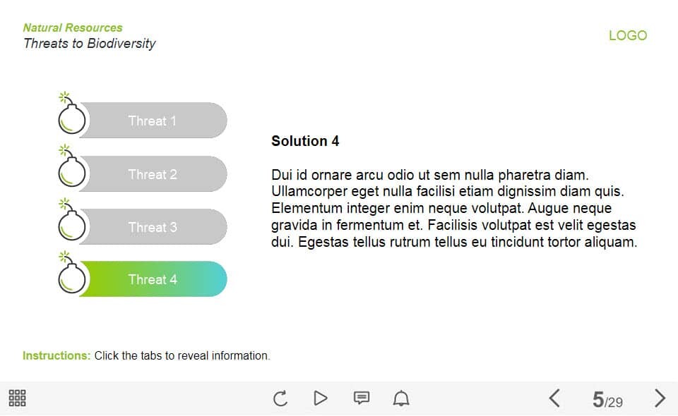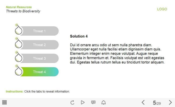 Four Vertical Tabs — Lectora Template. The unique eLearning interaction is designed with Lectora 18. The template contains 4 tabs placed at the left part of the slide. The user must click each of them to reveal the additional materials. The template slide is a ready-made product: all you need is to insert it into the projects and fill with own training content. It’s recommended to launch it on the devices with the screen size more than 7 inches.