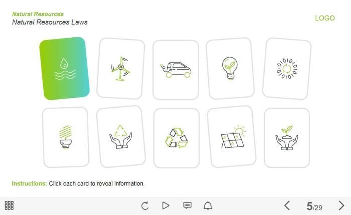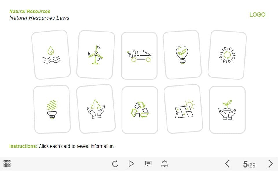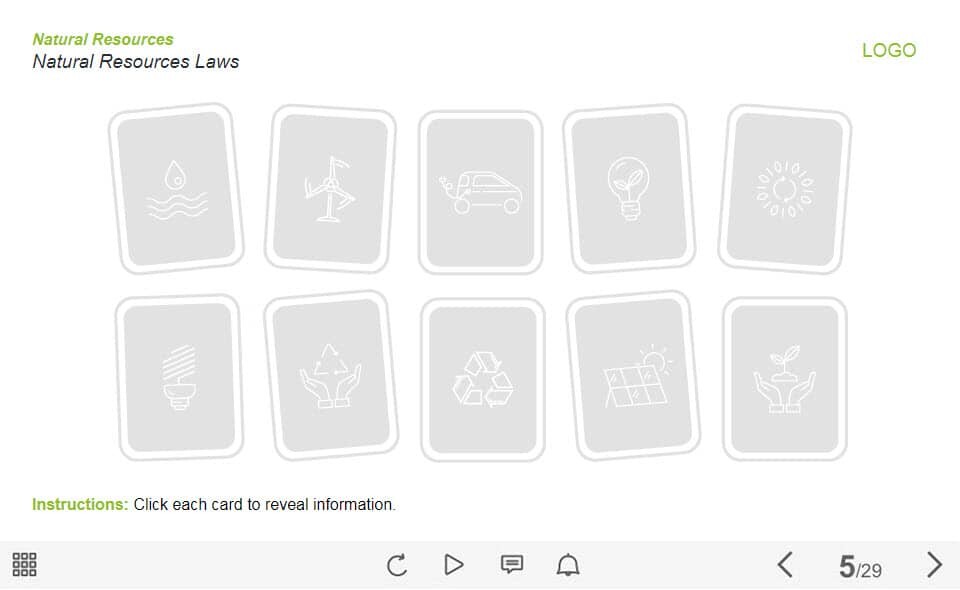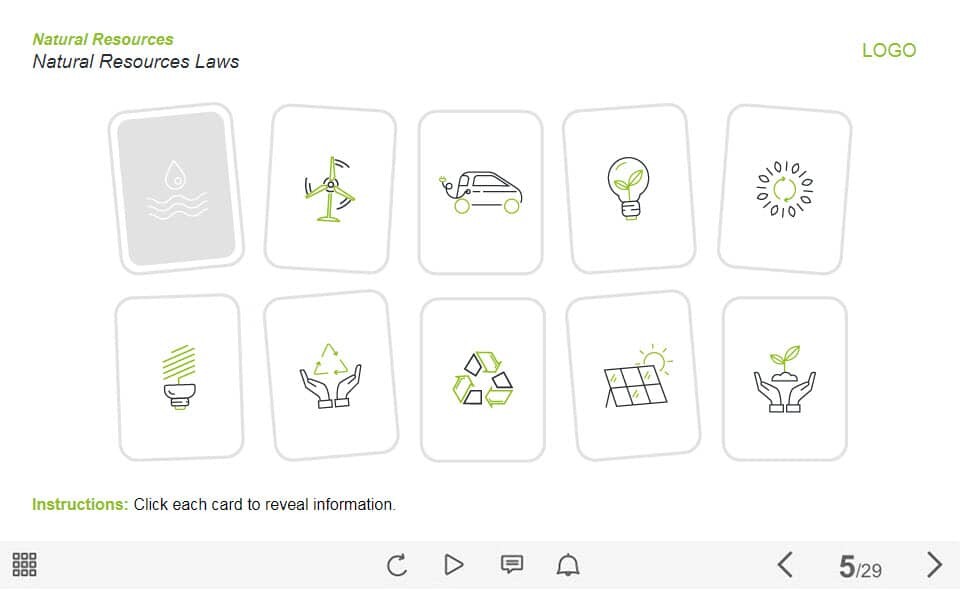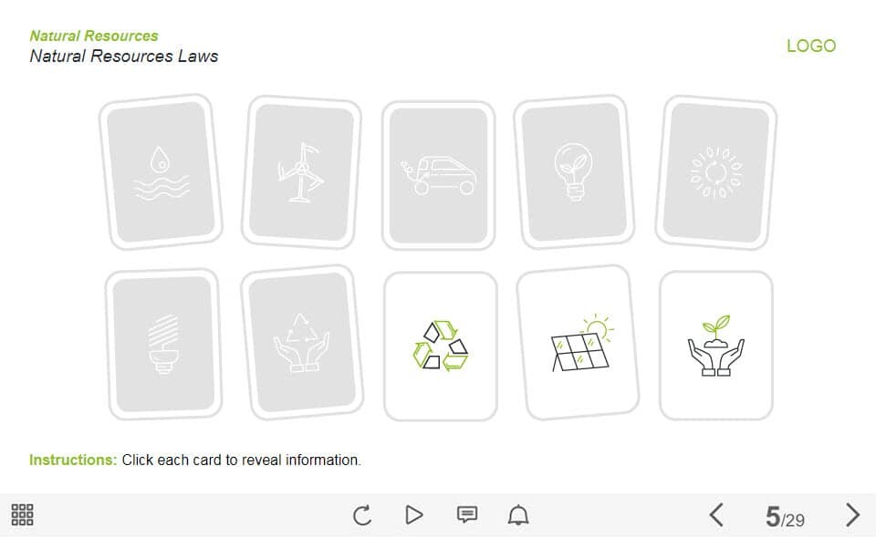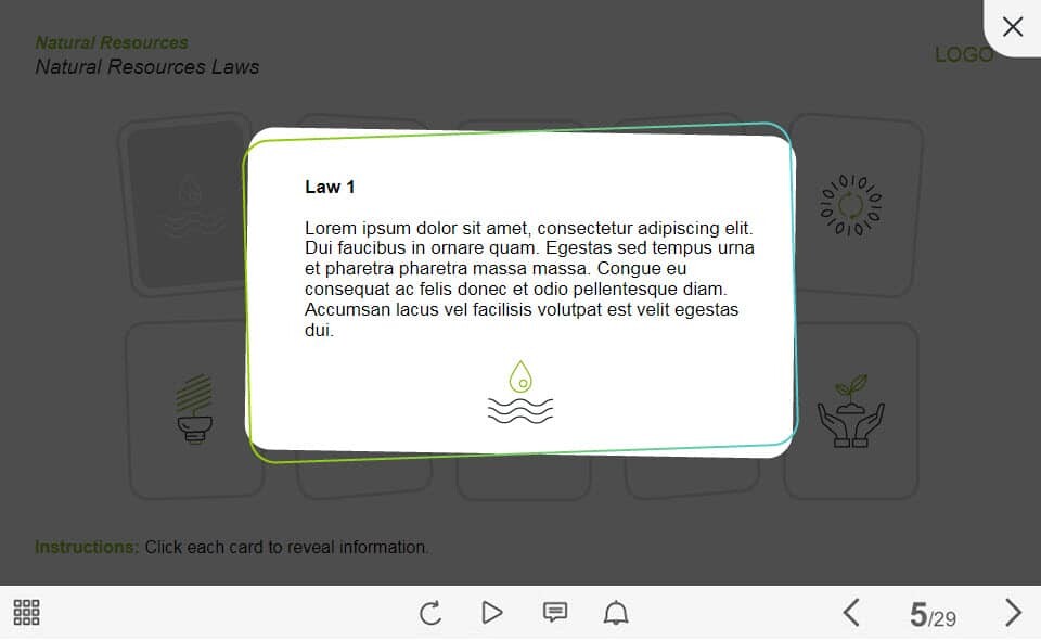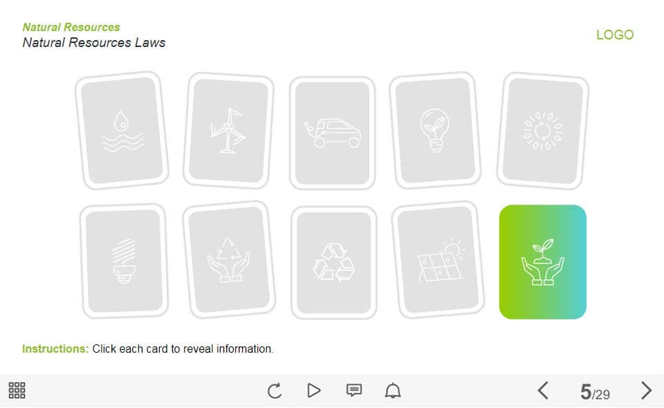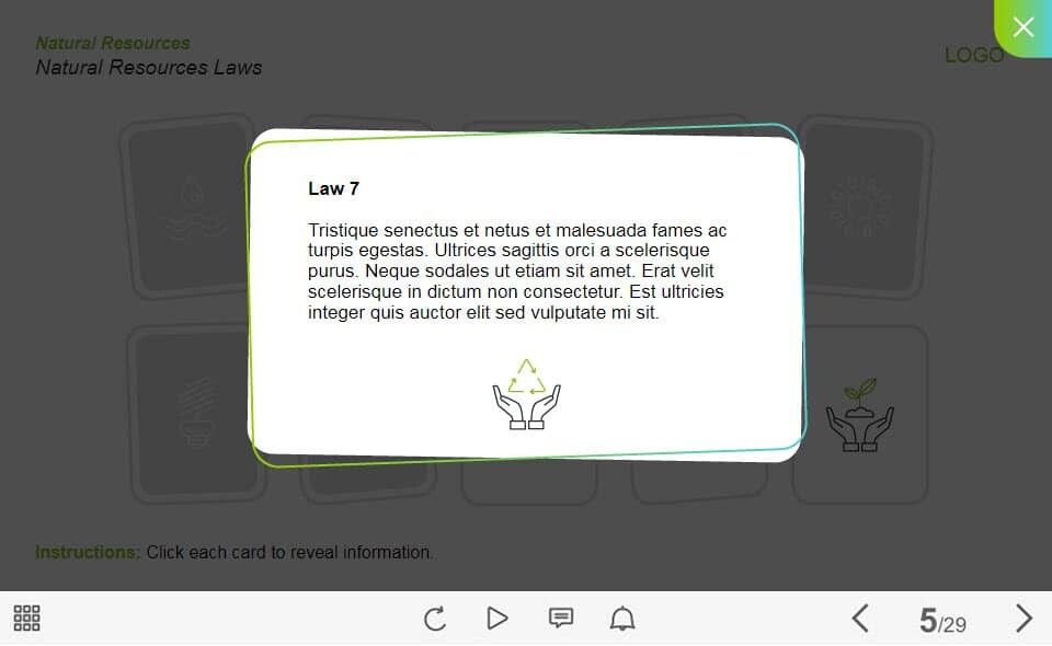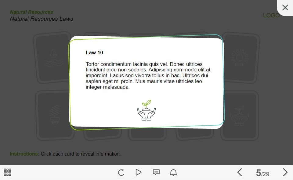 Clickable Cards — Lectora Template. The unique eLearning interaction is designed with Lectora 18. The template contains 10 clickable buttons designed as cards. The user must click each of them to reveal the additional materials in pop-ups. The template slide is a ready-made product: all you need is to insert it into the projects and fill with own training content. It’s recommended to launch it on the devices with the screen size more than 7 inches.