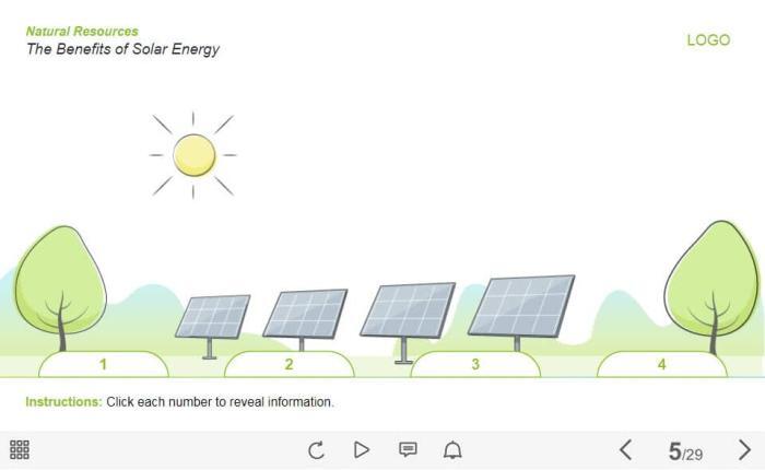 Solar Energy Tabs — Lectora Template. The unique eLearning interaction is designed with Lectora 19. The template contains 4 clickable tabs placed at the bottom part of he slide. The user must click each of them to reveal the additional materials. The template slide is a ready-made product: all you need is to insert it into the projects and fill with own training content. It’s recommended to launch it on the devices with the screen size more than 7 inches.