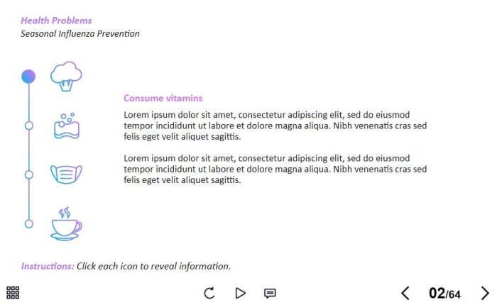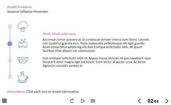 Influenza Prevention Icons — Lectora Template. The unique eLearning interaction is designed with Lectora 18 software. The template contains four clickable icons arranged in the left part of the screen. The user must click on them to reveal the additional materials. The template is a ready-made product: all you need is to insert it into the projects and fill with own training content. It’s recommended to launch it on the devices with the screen size more than 7 inches.