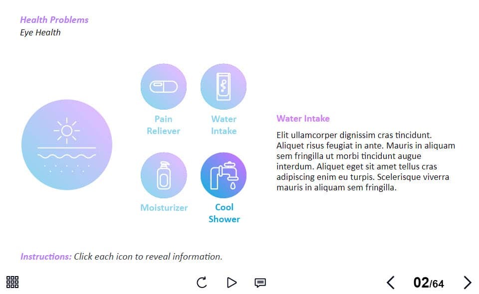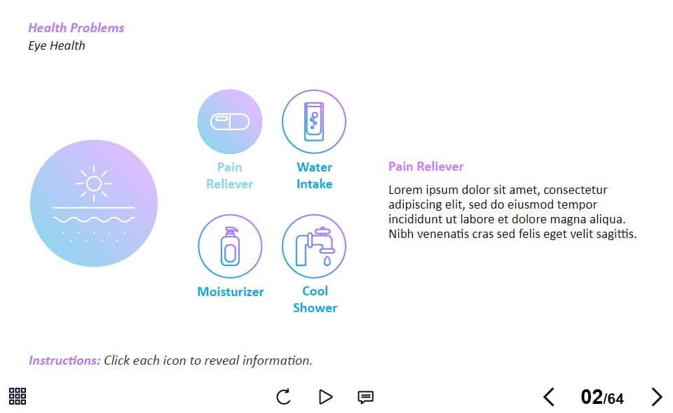 Sunburn Treatments — Lectora Template. The unique eLearning interaction is designed with Lectora 18 software. The template contains 4 clickable objects designed as thematic icons. The user must click on each of them to reveal the additional materials. The template is a ready-made product: all you need is to insert it into the projects and fill with own training content. It’s recommended to launch it on the devices with the screen size more than 7 inches.