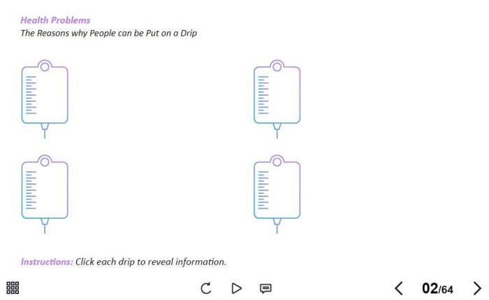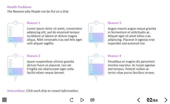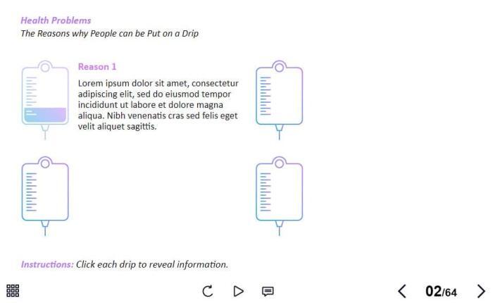 Drip Treatments — Lectora Template. The unique eLearning interaction is designed with Lectora 18 software. The template contains 4 clickable objects designed as drips. The user must click each of them to reveal the additional materials. The template is a ready-made product: all you need is to insert it into the projects and fill with own training content. It’s recommended to launch it on the devices with the screen size more than 7 inches.