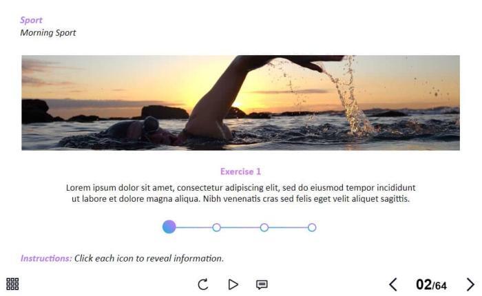 Morning Sport Activities — Lectora Template. The unique eLearning interaction is designed with Lectora 18 software. The template contains a horizonal timeline with four clickable dots. The user must click each dot to reveal the additional materials. The template is a ready-made product: all you need is to insert it into the projects and fill with own training content. It’s recommended to launch it on the devices with the screen size more than 7 inches.