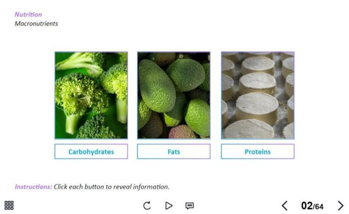 Macronutrients Flip Cards — Lectora Template. The unique eLearning interaction is designed with Lectora 18 software. The template contains 3 flip cards. The user must click each of them to reveal the additional materials. The template is a ready-made product: all you need is to insert it into the projects and fill with own training content. It’s recommended to launch it on the devices with the screen size more than 7 inches.