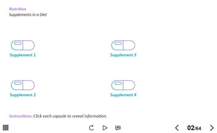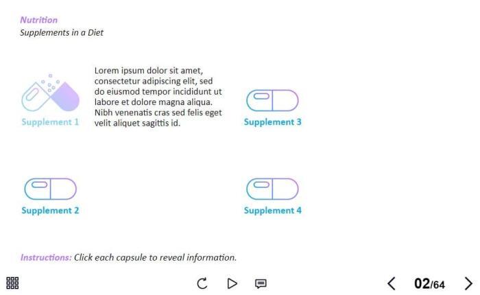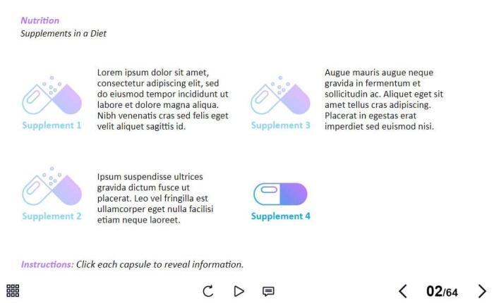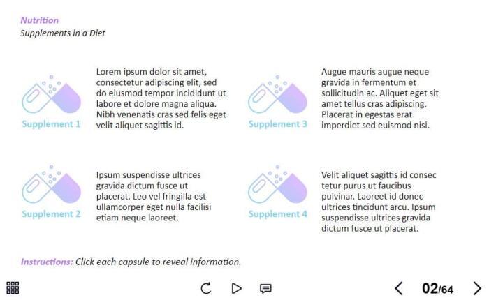Supplements in a Diet — Lectora Template. The unique eLearning interaction is designed with Lectora 18 software. The template contains 4 clickable objects desinged as pills. The user must click each of them to reveal the additional materials. The template is a ready-made product: all you need is to insert it into the projects and fill with own training content. It’s recommended to launch it on the devices with the screen size more than 7 inches.