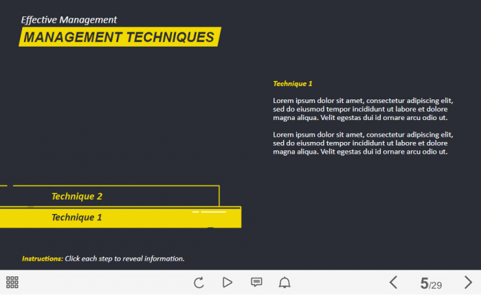 Management Technique Steps — Lectora Template. The unique eLearning interaction is designed with Trivantis Lectora 18 software. The template contains 5 tabs placed at the left part of the screen. The user must click each of them to reveal the additional materials. The template slide is a ready-made product: all you need is to insert it into the projects and fill with own training content. It’s recommended to launch it on the devices with the screen size more than 7 inches.