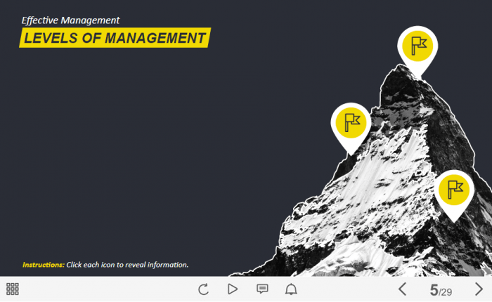 Mountain Markers — Lectora Template. The unique eLearning interaction is designed with Lectora 18 tool. The template contains 3 markers placed over the mointain image at the right part of the screen. The user must click each of them to reveal the additional materials. The template slide is a ready-made product: all you need is to insert it into the projects and fill with own training content. It’s recommended to launch it on the devices with the screen size more than 7 inches.