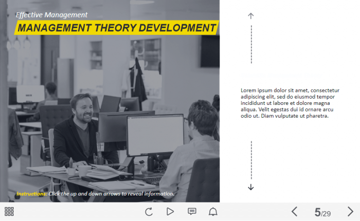 Vertical Slideshow — Lectora Template. The unique eLearning interaction is designed with Lectora 18 tool. The template represents a well-designed vertical slideshow. The user must click the up and down arrows to switch between the slides and reveal the additional materials. The template slide is a ready-made product: all you need is to insert it into the projects and fill with own training content. It’s recommended to launch it on the devices with the screen size more than 7 inches.